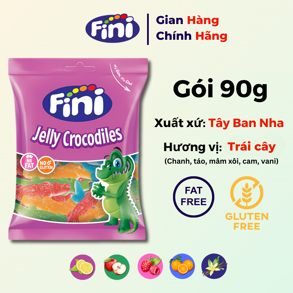 - Vị trái cây tươi mát: Kẹo dẻo Fini Jelly Crocodiles có 5 hương vị trái cây hấp dẫn: chanh, táo, cam, mâm xôi và vani, cho bạn trải nghiệm vị giác đa dạng và thú vị.
