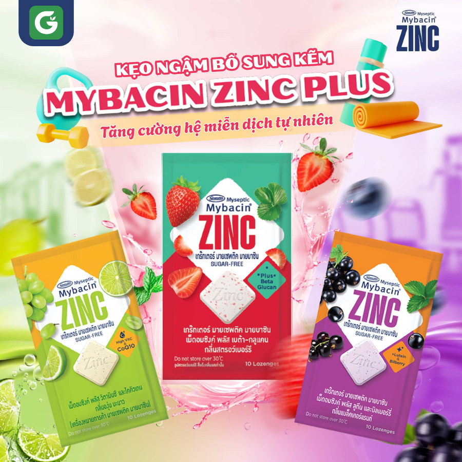 Mua tại TiktokKẹo ngậm Mybacin Zinc Plus là sản phẩm đến từ Thái Lan với hương vị thơm ngon và cảm giác the mát, dễ chịu nơi cổ họng. Sản phẩm thích hợp sử dụng hàng ngày, mang lại trải nghiệm vị giác độc đáo với ba hương vị hấp dẫn.