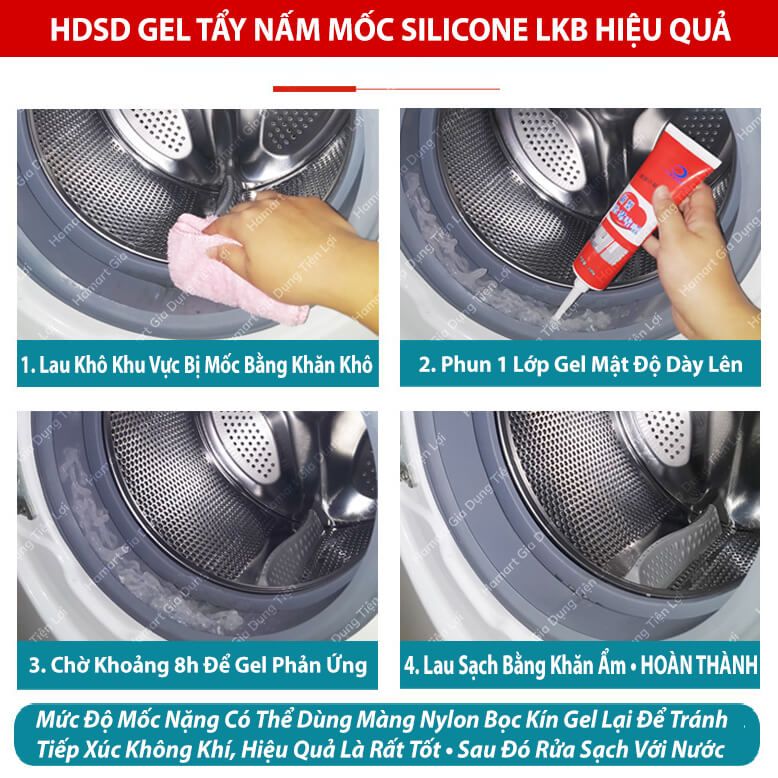 - Gel tẩy nấm mốc silicone, gioăng cửa máy giặt, mép tường, viền bếp, kính, gỗ, men, inox, thạch
