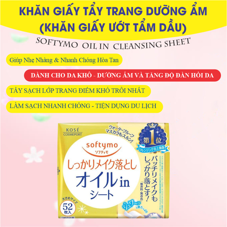 Khăn Giấy Tẩy Trang Dầu Giúp Sạch Sâu Kosé Softymo Oil in Cleansing Sheet (52 miếng)Xuất xứ : Nhật BảnSản phẩm được làm bằng 100% vật liệu sợi tự nhiên cùng với các thành phần làm sạch dịu nhẹ nguồn...
