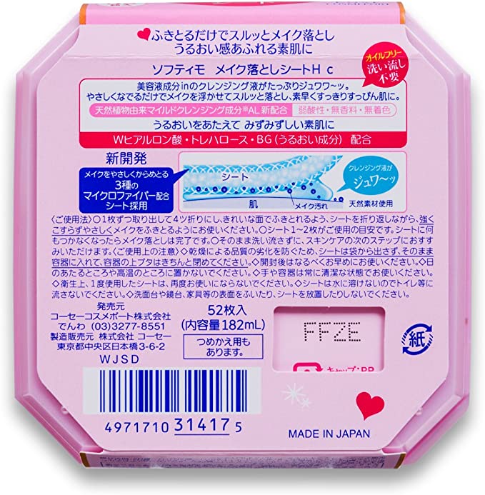 Khăn Giấy Tẩy Trang Dưỡng Ẩm Kosé Softymo Axit Hyaluronic Cleansing Sheet H 52 miếng Xuất Xứ: Nhật Bản Quy Cách: 52 miếng Sản phẩm được tẩm sẵn dung dịch tẩy trang trong chất liệu