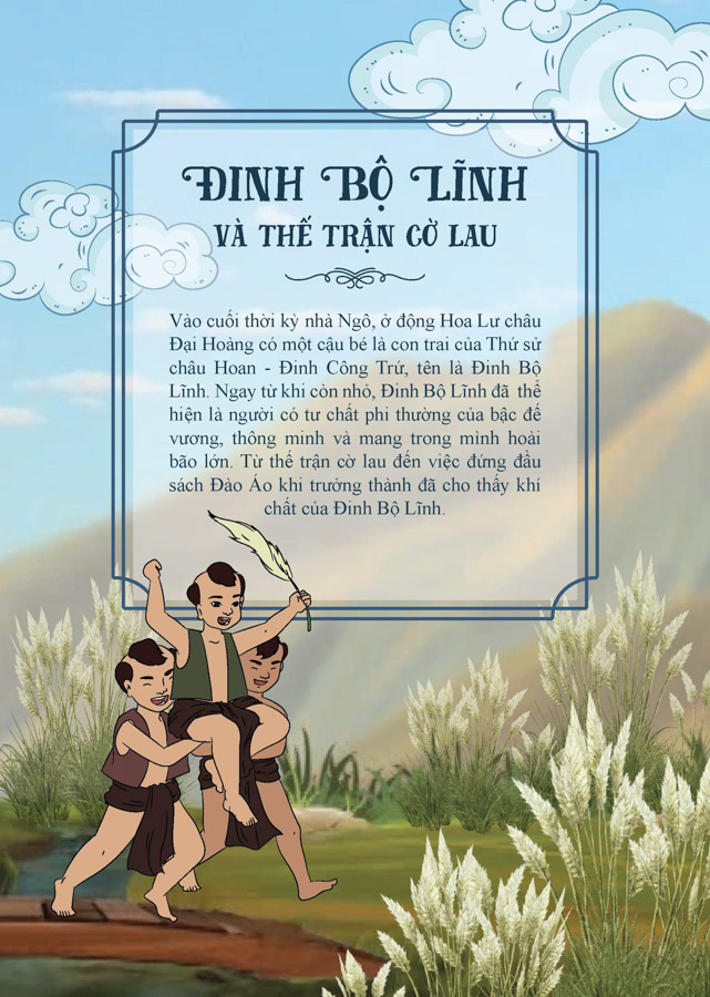 Bộ sách “Truyện tranh lịch sử Việt Nam – Khát vọng non sông” gồm hàng trăm tập, giới thiệu ngắn gọn, sinh động những truyền thuyết đầy tính nhân văn và những sự kiện, những nhân vật nổi tiếng trong lịch sử hàng nghìn năm của dân tộc Việt Nam. Đinh Bộ Lĩnh và thế trận cờ lau – Ngay từ nhỏ, Đinh Bộ Lĩnh đã thể hiện người có tư chất phi thường của bậc đế vương, thông minh và mang trong mình hoài bão lớn. Thời kỳ Hậu Ngô Vương, phương Nam, phương Bắc rối ren, ông thay Trần Minh Công giữ đất Hoa Lư, chiêu mộ hào kiệt, thủ hiểm một nơi, từng bước dưỡng binh hùng tướng mạnh chờ thời cơ nhằm thu phục các sứ quân, thống nhất đất nước.