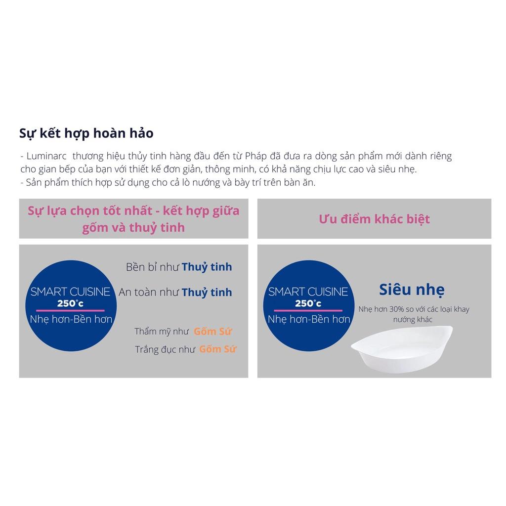 - Các sản phẩm khay nướng của Luminarc đã được kiểm tra vệ sinh an toàn thực phẩm theo quy định của Bộ Y Tế và cam kết 100% không chì, không chất độc hại. Khay nướng Luminarc được thiết kế một cách tinh tế, tối giản, siêu nhẹ, chống va đập gấp ba lần so với các đồ dùng bếp bằng gốm sứ khác, đủ sâu để chứa một lượng lớn thực phẩm. Hình dáng nhẹ nhàng, tiện dụng để dễ cầm nắm. Màu trắng sữa, phù hợp với tất cả các không gian bếp mà còn tôn nên sự sang trọng.