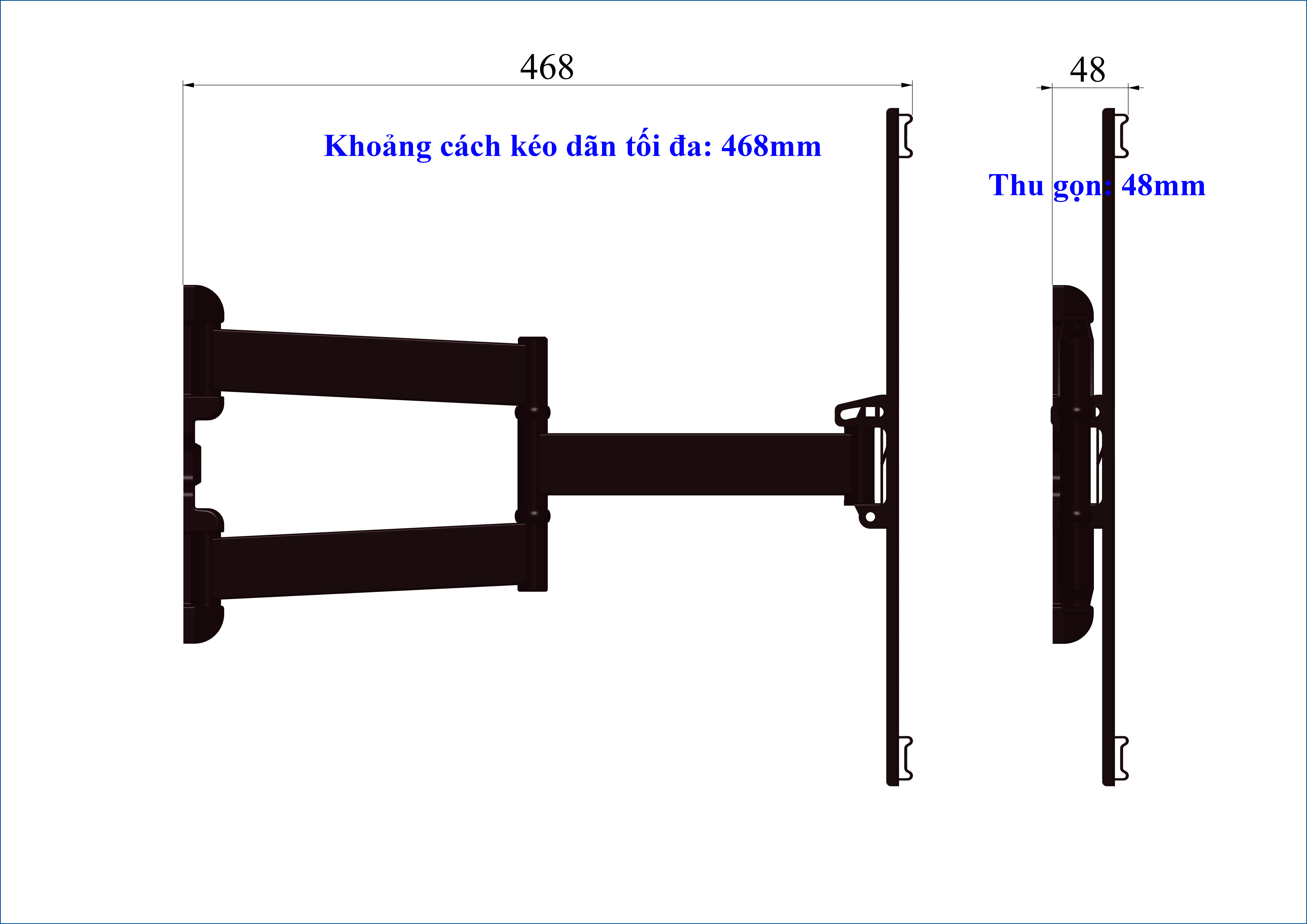 Thông số kĩ thuật - Vesa: 400x400 mm - Xoay 180 độ tại các khớp nối - Thiết kế kẹp nhựa đế nẹp dây điện - Khoảng cách kéo dãn tối đa: 468mm - Thu