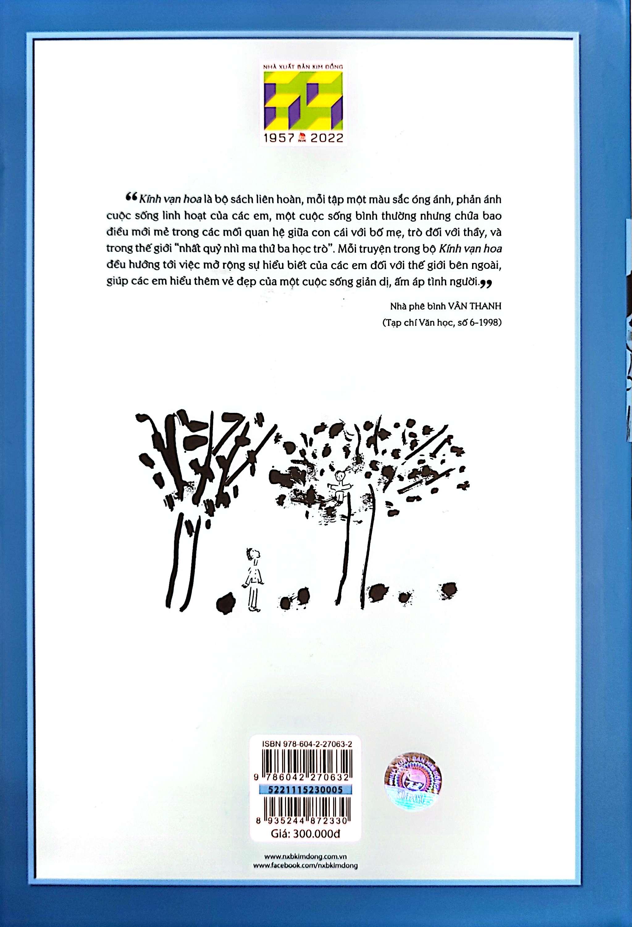 “Kính Vạn Hoa là bộ sách liên hoàn, mỗi tập một màu sắc óng ánh, phản ánh cuộc sống linh hoạt của các em, một cuộc sống bình thường nhưng chứa bao điều mới mẻ trong các mối quan hệ giữa con cái với bố mẹ, trò đối với thầy, và trong thế giới “nhất quỷ nhì ma thứ ba học trò”. Mỗi truyện trong bộ Kính Vạn Hoa đều hướng tới việc mở rộng sự hiểu biết của các em đối với thế giới bên ngoài, giúp các em hiểu thêm vẻ đẹp của một cuộc sống giản dị, ấm áp tình người.”