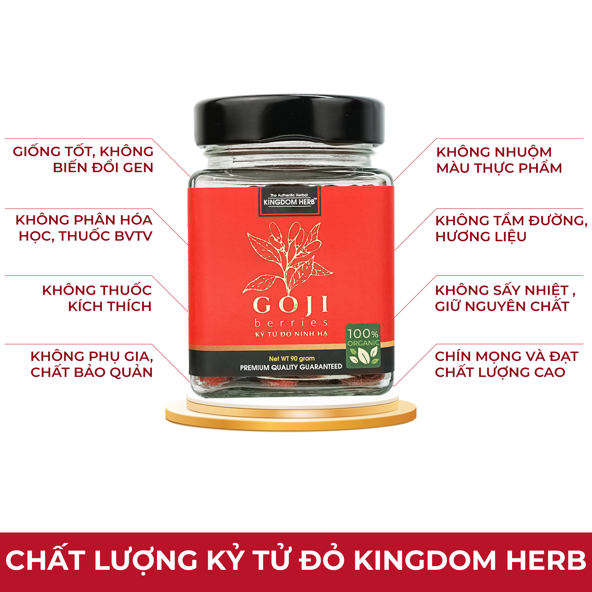 - Nói không với hàng xách tay kém chất lượng, trôi nổi trên thị trường Tại sao nên sử dụng kỷ tử hữu cơ Ninh Hạ Kingdom Herb: - Sản phẩm chất lượng nguồn giống tốt, không bị biến đổi gen, không gluten - Không sử dụng phân bón hóa học, thuốc bảo vệ thực vật - Không sử dụng thuốc kích thích tăng trường - Không phụ gia và chất bảo quản - Không nhuộm màu thực phẩm - Không tẩm đường và hương liệu - Không sấy nhiệt cao, giữ nguyên dưỡng chất