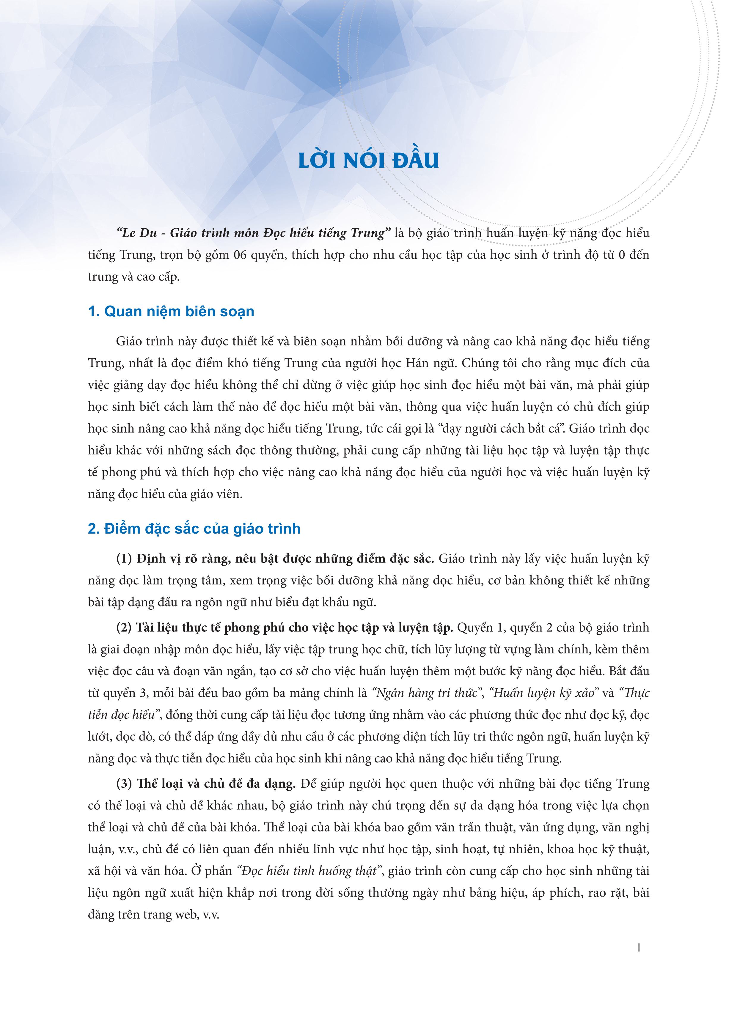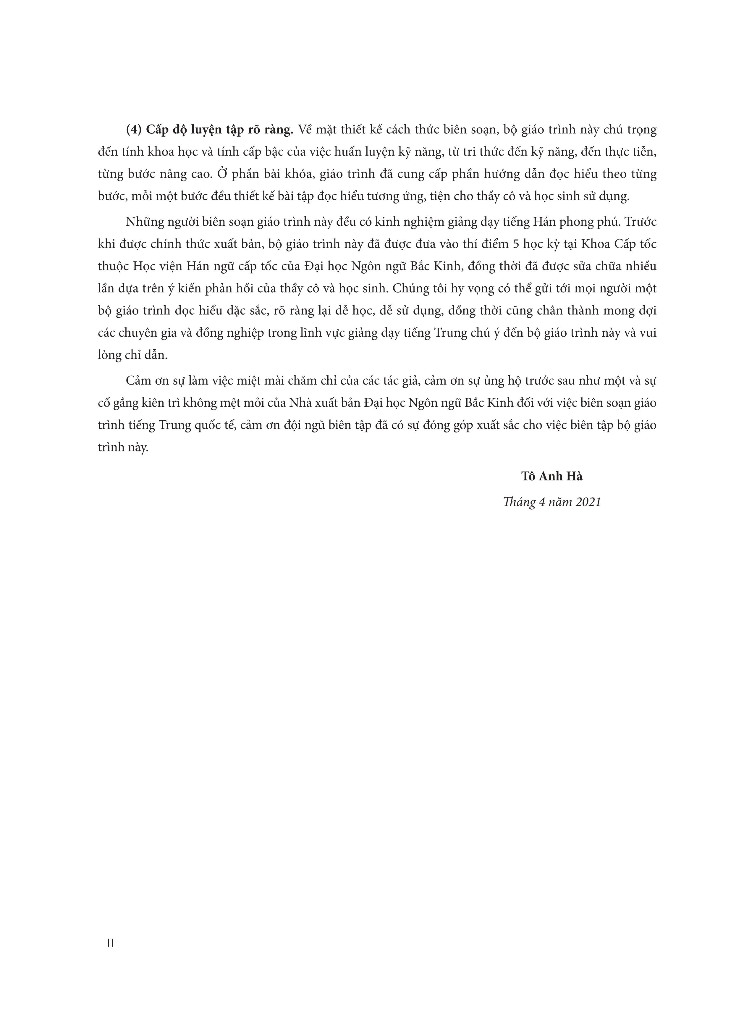 Dung lượng quyển giáo trình này khá lớn, nội dung rộng rãi, bài tập phong phú, vừa thích hợp sử dụng cho người học tiếng Trung “lớp dài hạn” theo chế độ học kỳ, cũng thích hợp sử dụng cho người học tiếng Trung lớp nâng cao ngắn hạn dịp đông, hè.