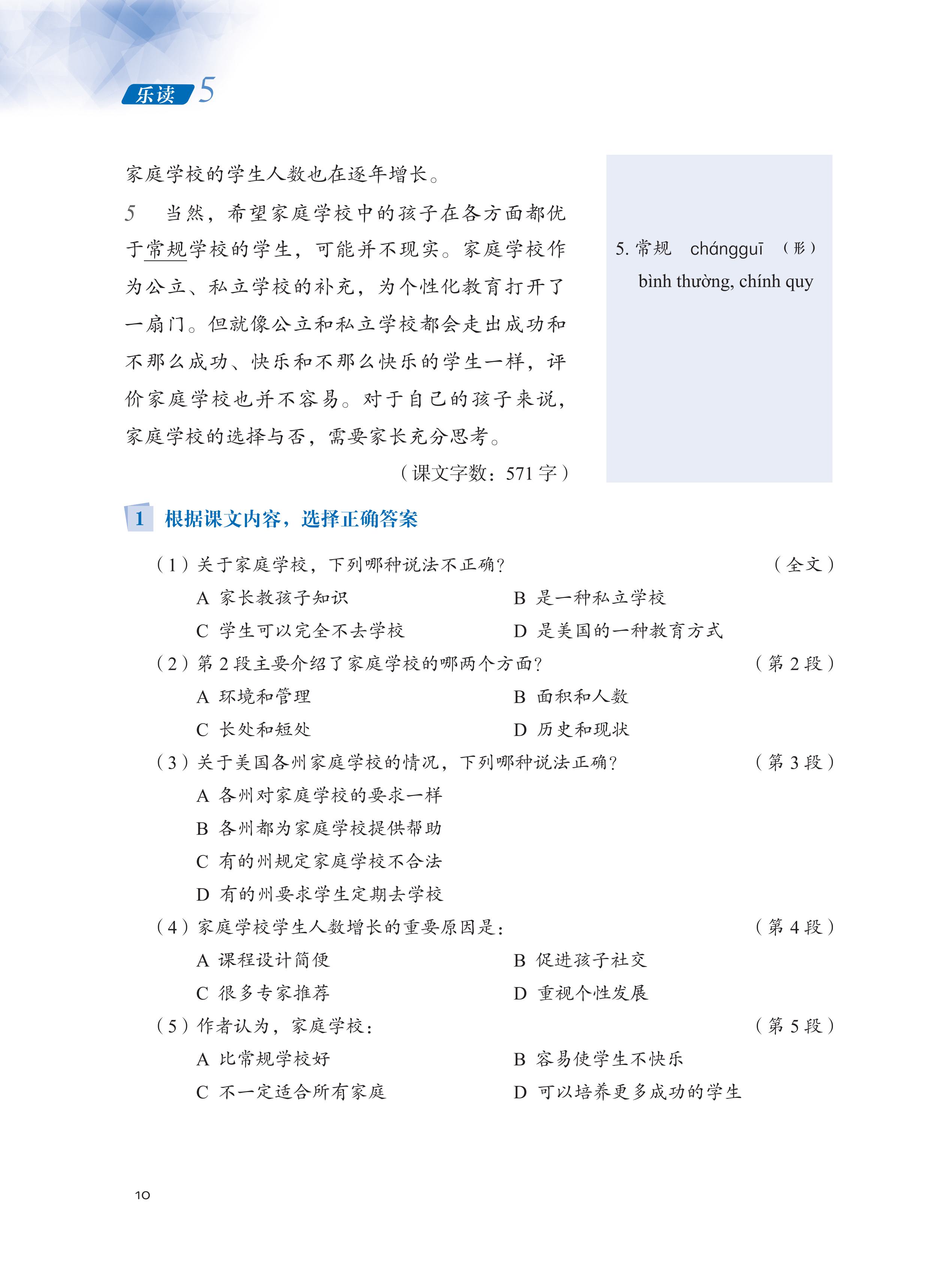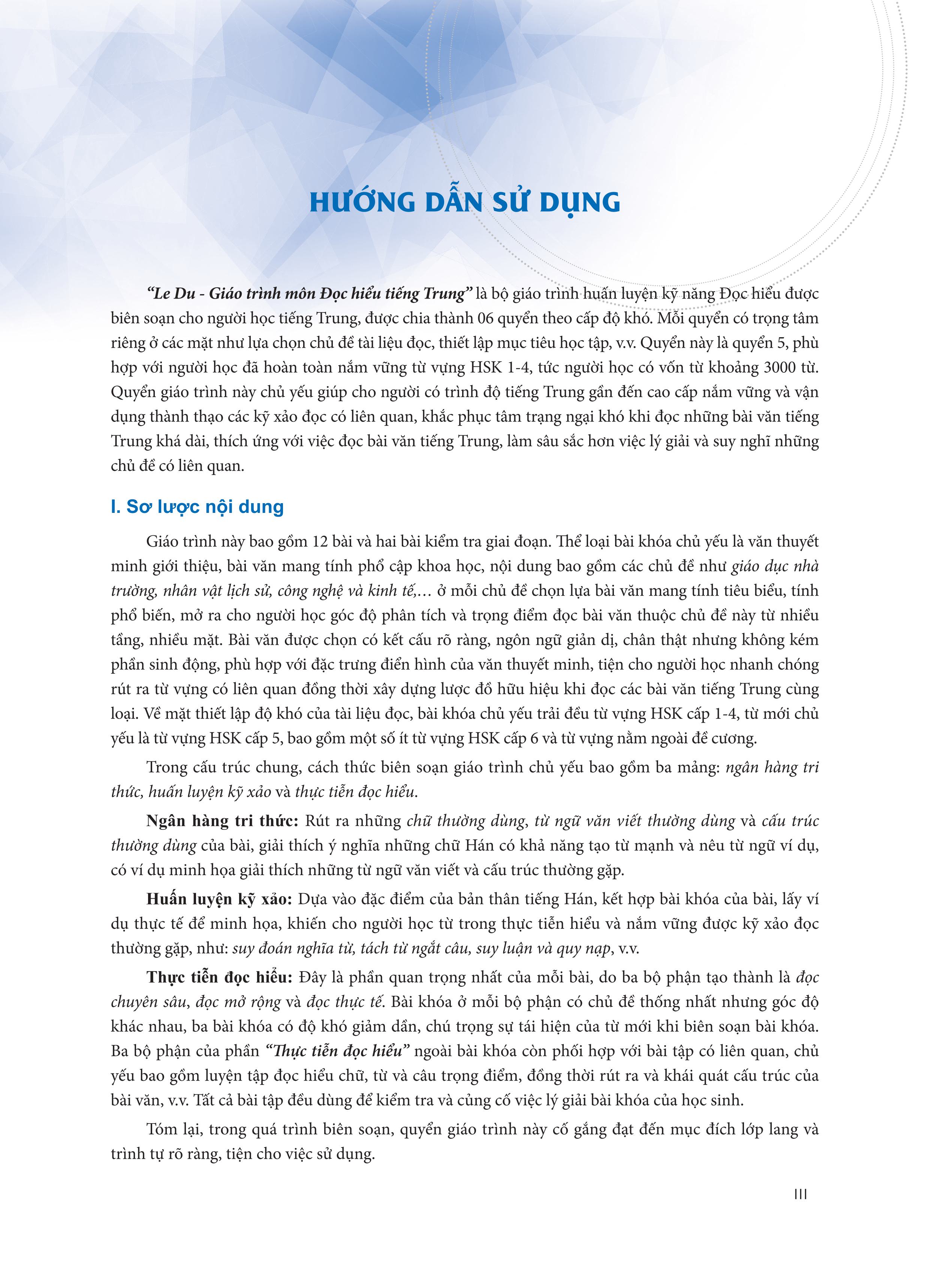 “Le Du - Giáo trình môn Đọc hiểu tiếng Trung” là bộ giáo trình huấn luyện kỹ năng Đọc hiểu được biên soạn cho người học tiếng Trung, được chia thành 06 quyển theo cấp độ khó. Mỗi quyển có trọng tâm riêng ở các mặt như lựa chọn chủ đề tài liệu đọc, thiết lập mục tiêu học tập, v.v. Quyển này là quyển 5, phù hợp với người học đã hoàn toàn nắm vững từ vựng HSK 1-4, tức người học có vốn từ khoảng 3000 từ.