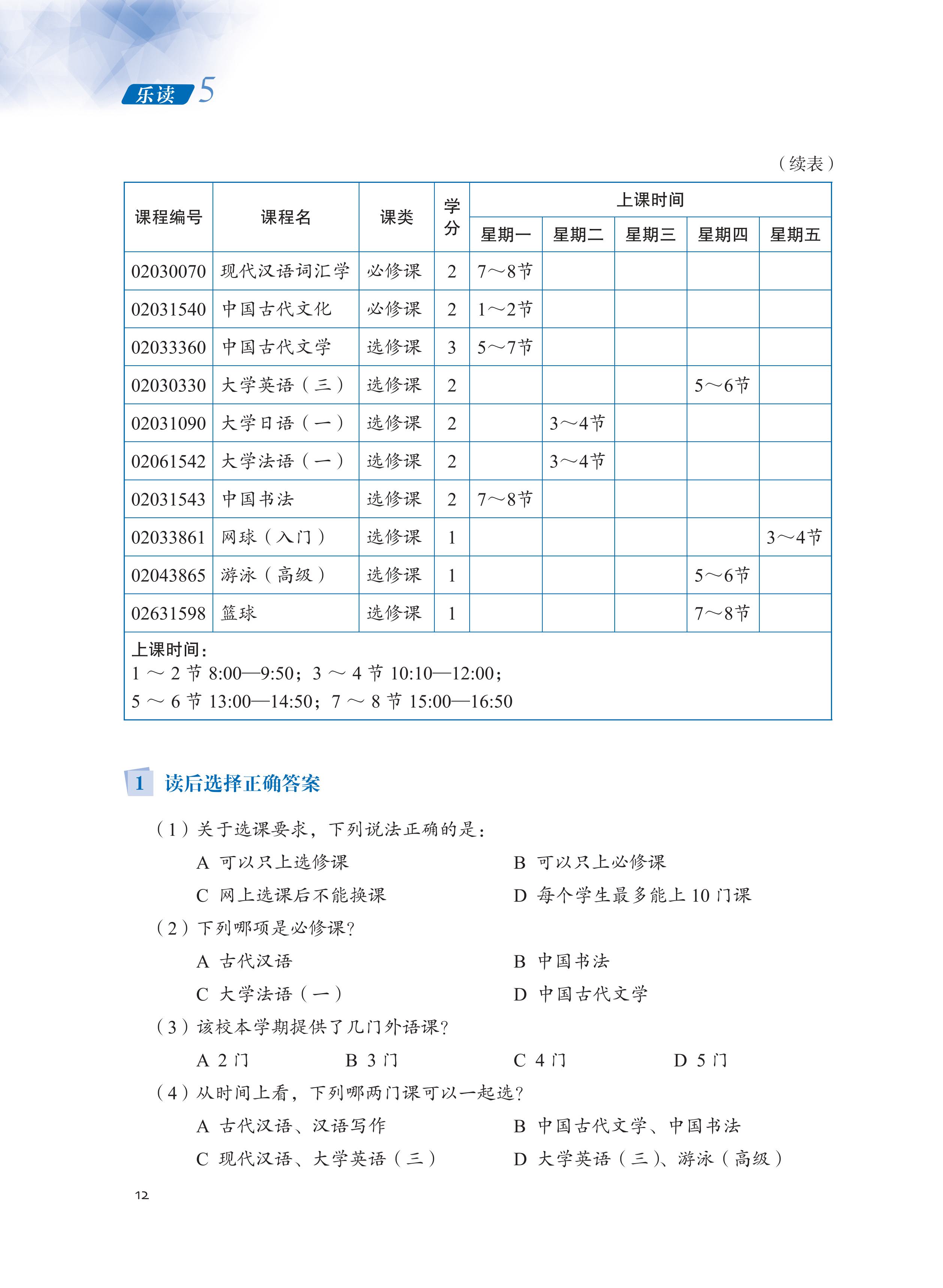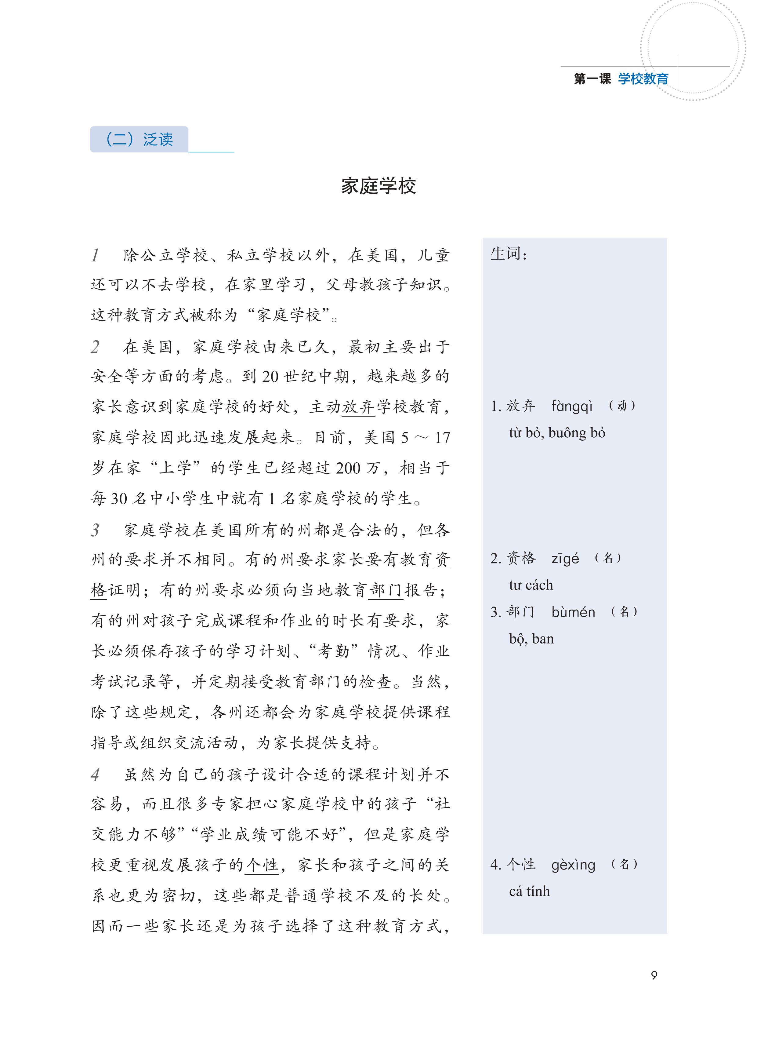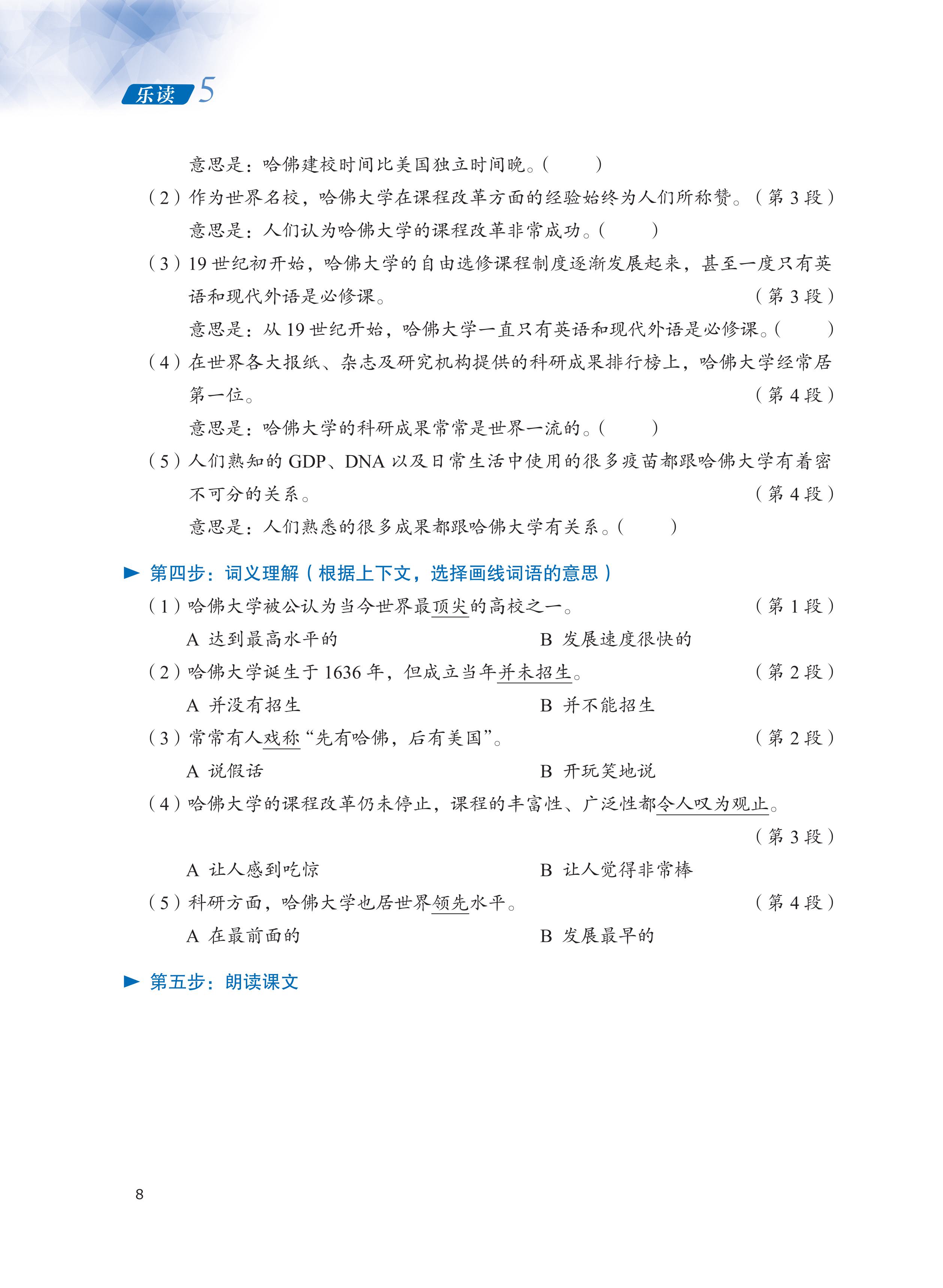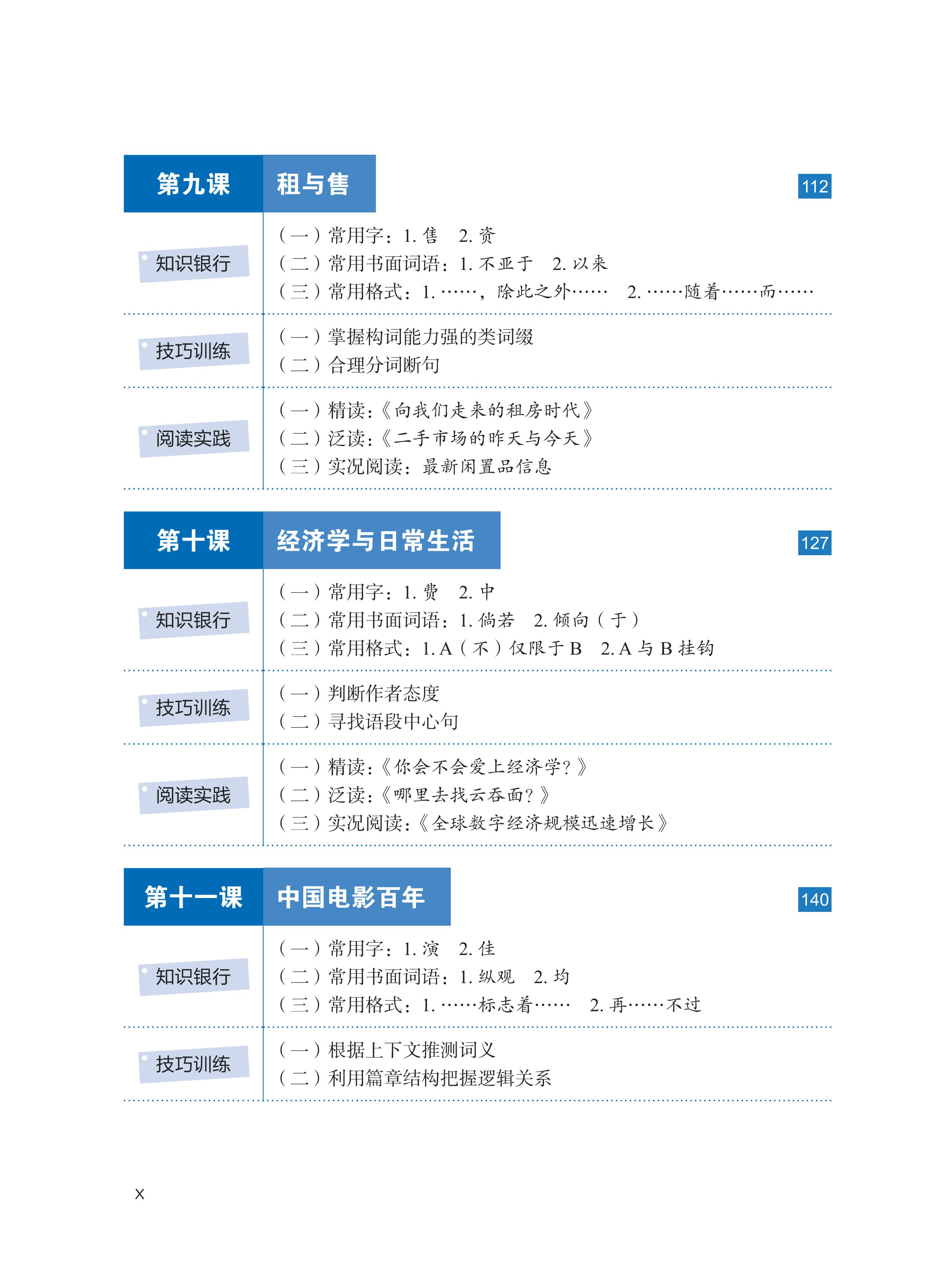 Thực tiễn đọc hiểu: Đây là phần quan trọng nhất của mỗi bài, do ba bộ phận tạo thành là đọc chuyên sâu, đọc mở rộng và đọc thực tế. Bài khóa ở mỗi bộ phận có chủ đề thống nhất nhưng góc độ khác nhau, ba bài khóa có độ khó giảm dần, chú trọng sự tái hiện của từ mới khi biên soạn bài khóa. Ba bộ phận của phần “Thực tiễn đọc hiểu” ngoài bài khóa còn phối hợp với bài tập có liên quan, chủ yếu bao gồm luyện tập đọc hiểu chữ, từ và câu trọng điểm, đồng thời rút ra và khái quát cấu trúc của bài văn, v.v. Tất cả bài tập đều dùng để kiểm tra và củng cố việc lý giải bài khóa của học sinh. Tóm lại, trong quá trình biên soạn, quyển giáo trình này cố gắng đạt đến mục đích lớp lang và trình tự rõ ràng, tiện cho việc sử dụng.