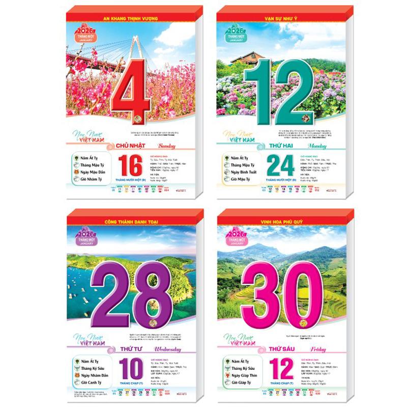 - Quyển Bloc lịch 2026 dùng gắn vào các loại bìa lịch treo tường, thay thế Bloc năm cũ. * QUY CÁCH BLOC LỊCH: - Chất lượng in công nghệ hiện đại, sắc nét, in