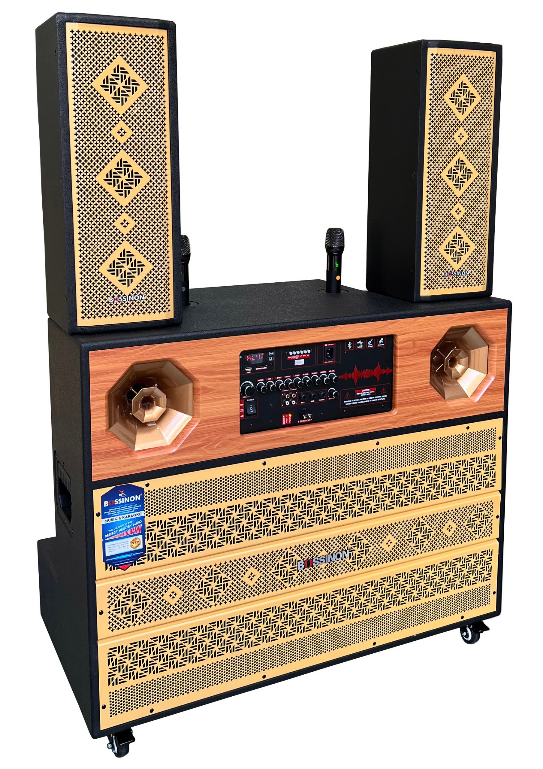_Nguồn DC 12V bat in _ Bass 2T x 2, Treble x 10 _ Sử dụng bo CLASS D _Hỗ trợ USB, HDMI, Bluetooth, guitar in, mic in _Phụ kiện 2 mic cầm tay không