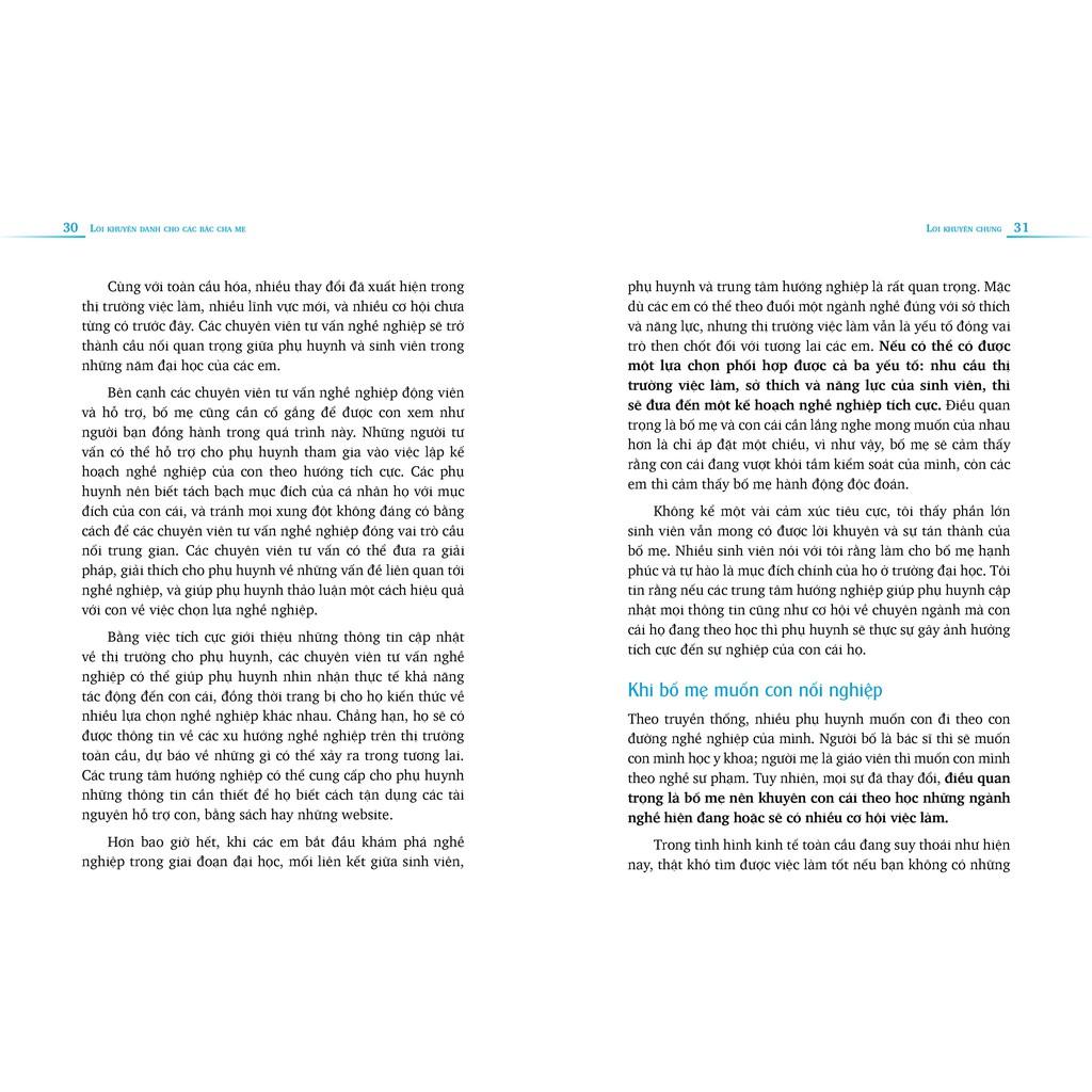Quyển sách được bố cục theo từng chủ đề, với các đề mục là những mối quan tâm hiện nay của các bậc phụ huynh, những thông tin cần biết về các trường đại học, các ngành học, các xu hướng và yêu cầu hiện nay trên thế giới.