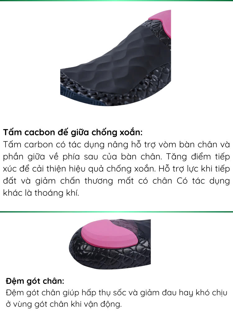 Vật liệu EVA mật độ riêng mềm dẻo, kết hợp đệm giảm chấn banh bàn chân polymer êm ái sẽ ôm sát theo bước chân giúp hoàn trả năng lượng tối đa khi vận động - Tăng sức bền khi chơi thể thao   Bề mặt vải nylon kết cấu chống trơn trượt với chất kháng khuẩn Silpure giúp giảm mùi hôi