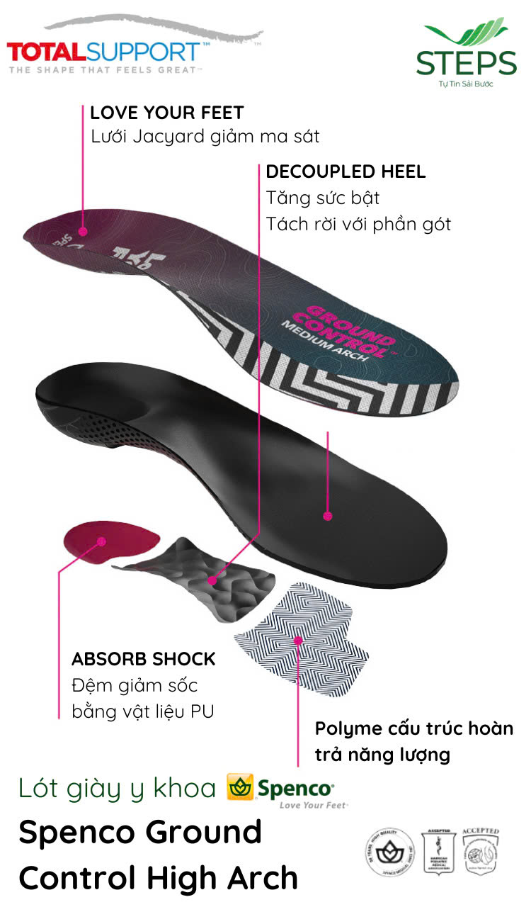 Lót giày y khoa Spenco Ground Control High Arch   Thiết kế đặc biệt, cải tiến mới của Spenco Total Support, đế chỉnh hình Spenco Ground Control với cấu trúc nâng linh hoạt ôm sát
