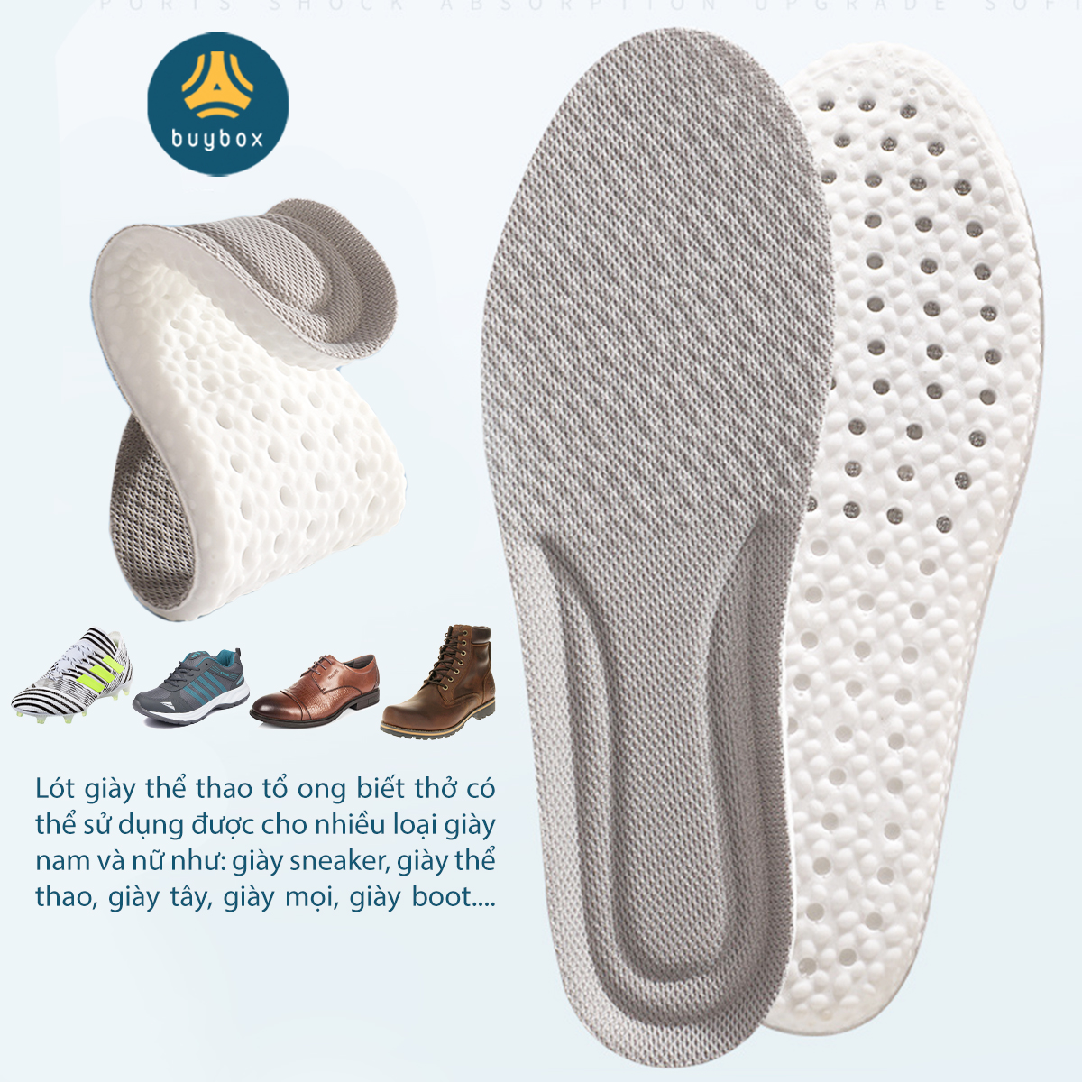 Lót giày thể thao tổ ong biết thở có thể sử dụng được cho nhiều loại giày nam và nữ như: giày sneaker, giày thể thao, giày tây, giày mọi, giày