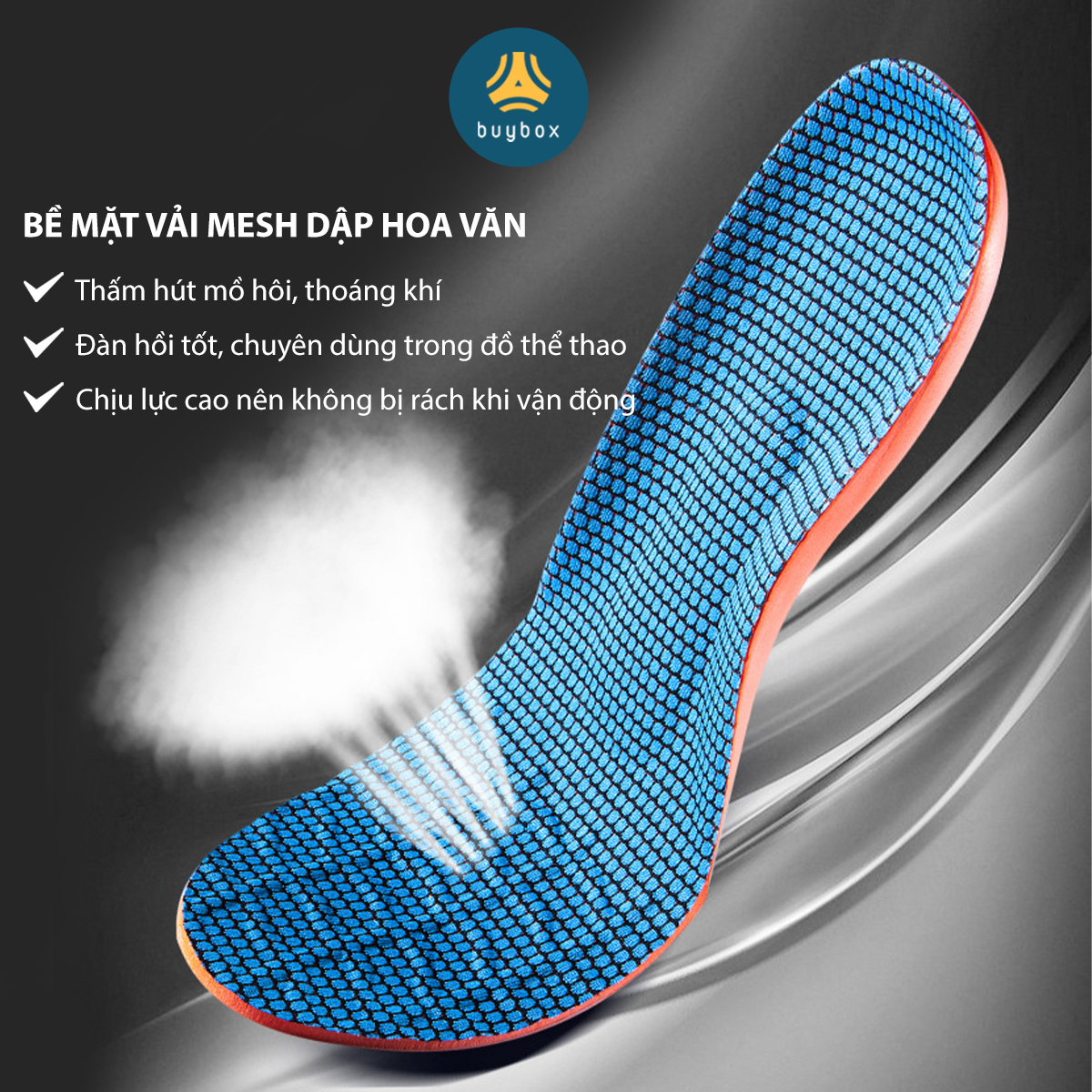 Thiết kế 4D kết hợp giảm sốc cơ học 3 điểm, chống trơn trượt và giảm thốn cho bàn chân Chất liệu vải mesh thoáng khí, hạn chế các tình trạng hôi chân hôi giày