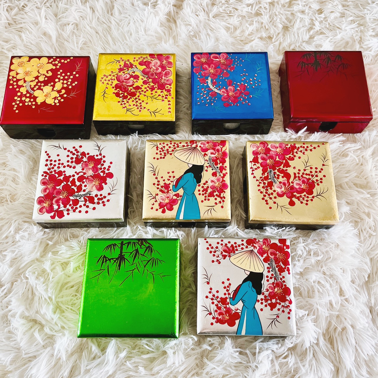 Hộp lót ly có nhiều mẫu khác nhau cho bạn lựa chọn dễ dàng, vẽ đồng quê và mai đào đa dạng, làm cho hộp lót ly thêm phần đẹp mắt