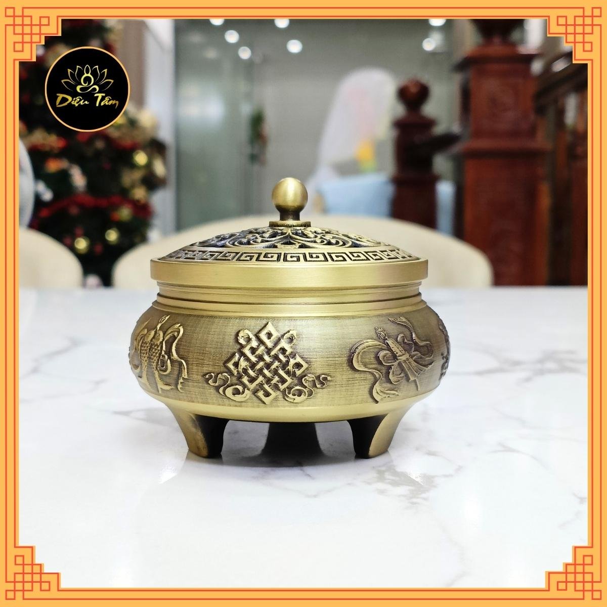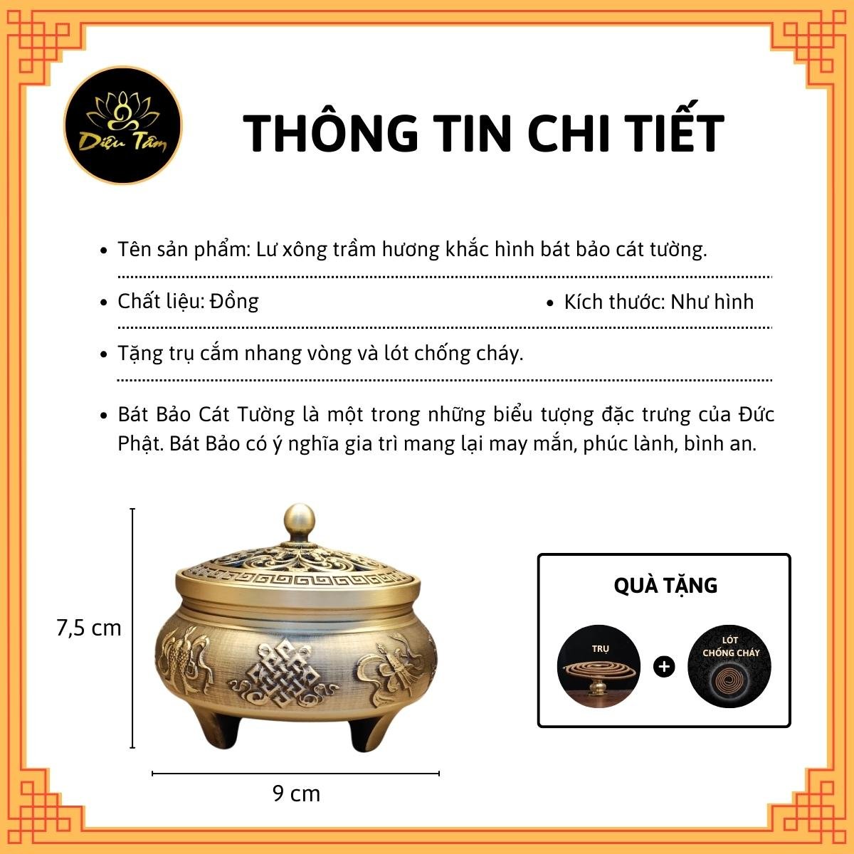 ✨Lư xông trầm hương Lư đồng khắc hình bát bảo cát tường lư đốt trầm tặng trụ và lót chống cháy đồ thờ cúng phong thủy Diệu Tâm