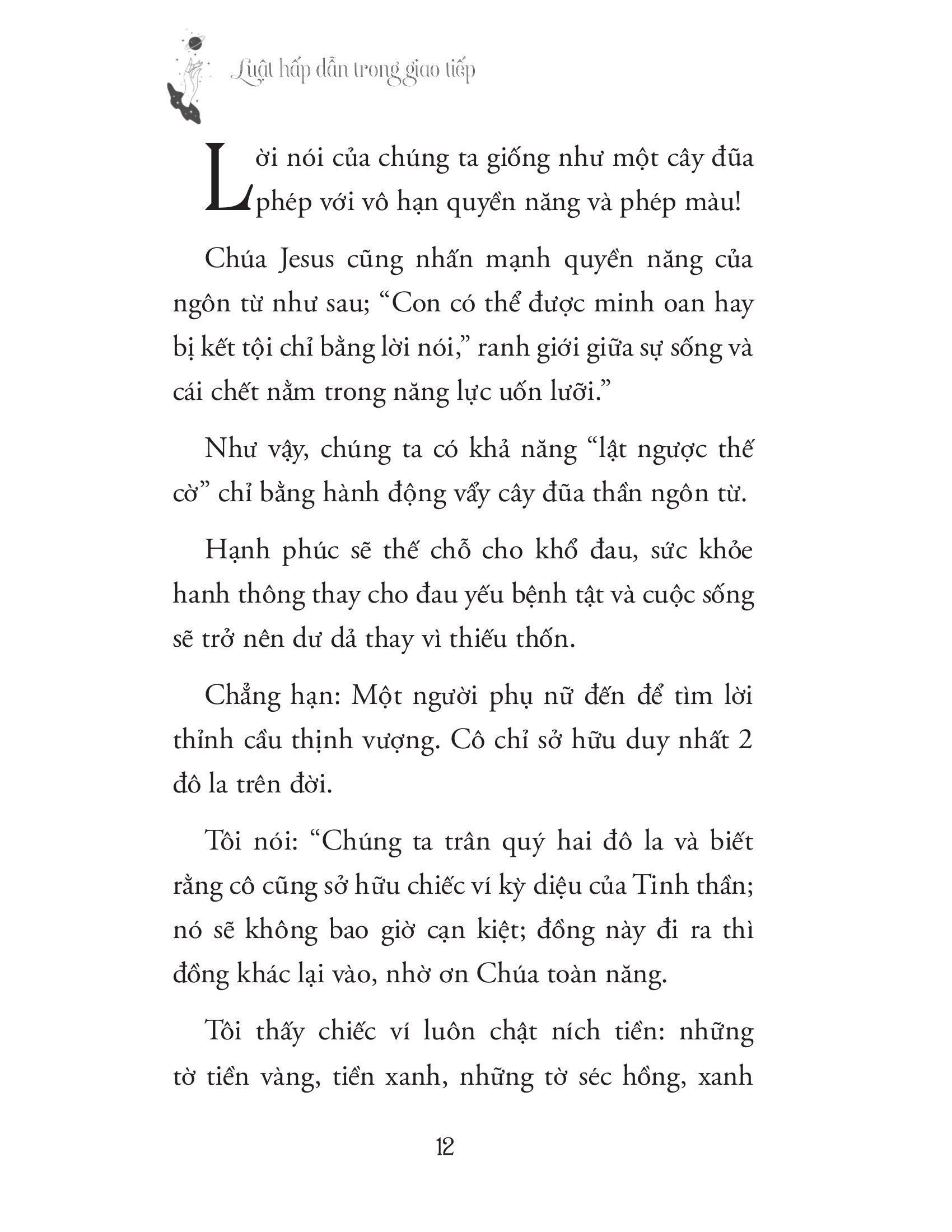 Nếu bạn nỗ lực và kiên trì, Luật hấp dẫn sẽ giúp bạn cải thiện cách giao tiếp để thu hút được tất cả những điều tích cực nhất. Đúc kết từ những lời thực hành khẳng định cùng những bài thuyết giảng từ bậc thánh nhân trong công cuộc thu hút năng lượng tích cực từ vũ trụ, cuốn sách đóng vai trò như một ngọn hải đăng soi sáng chúng ta trên con đường đi đến tiền tài, danh vọng, và thành công trong cuộc sống thông qua giao tiếp.