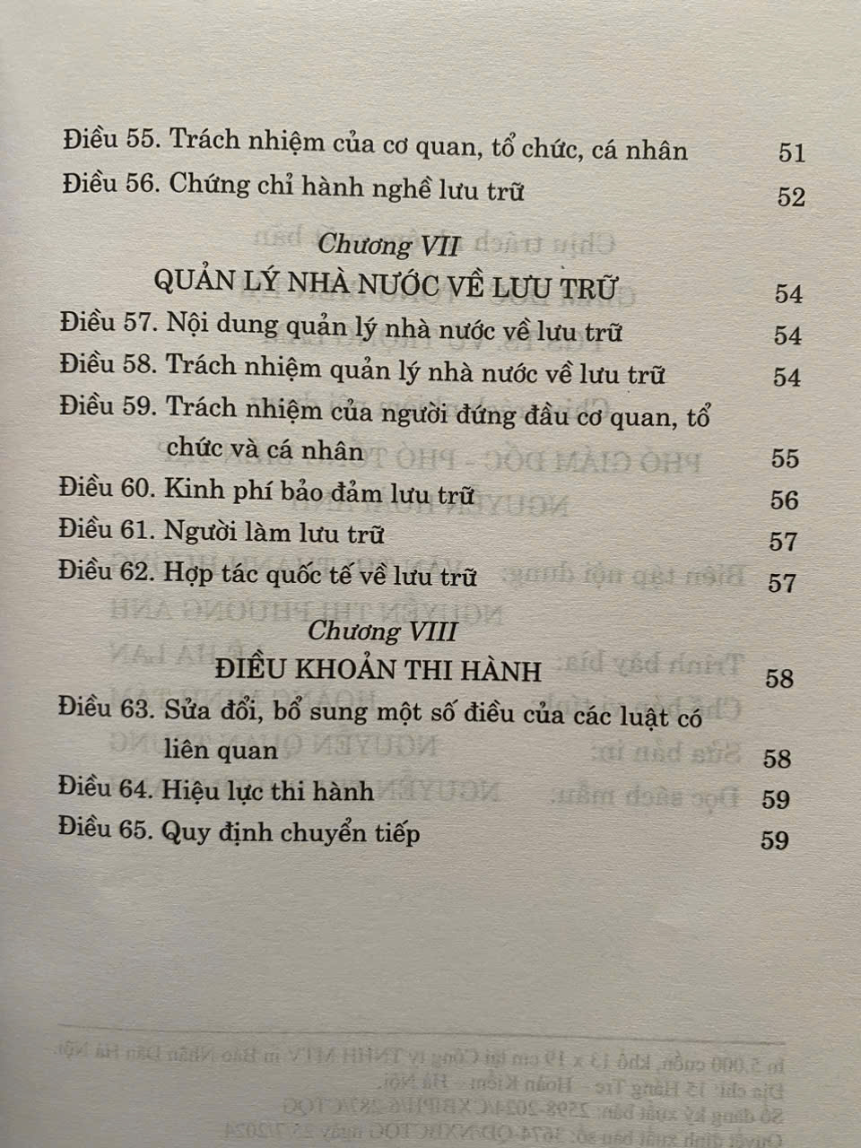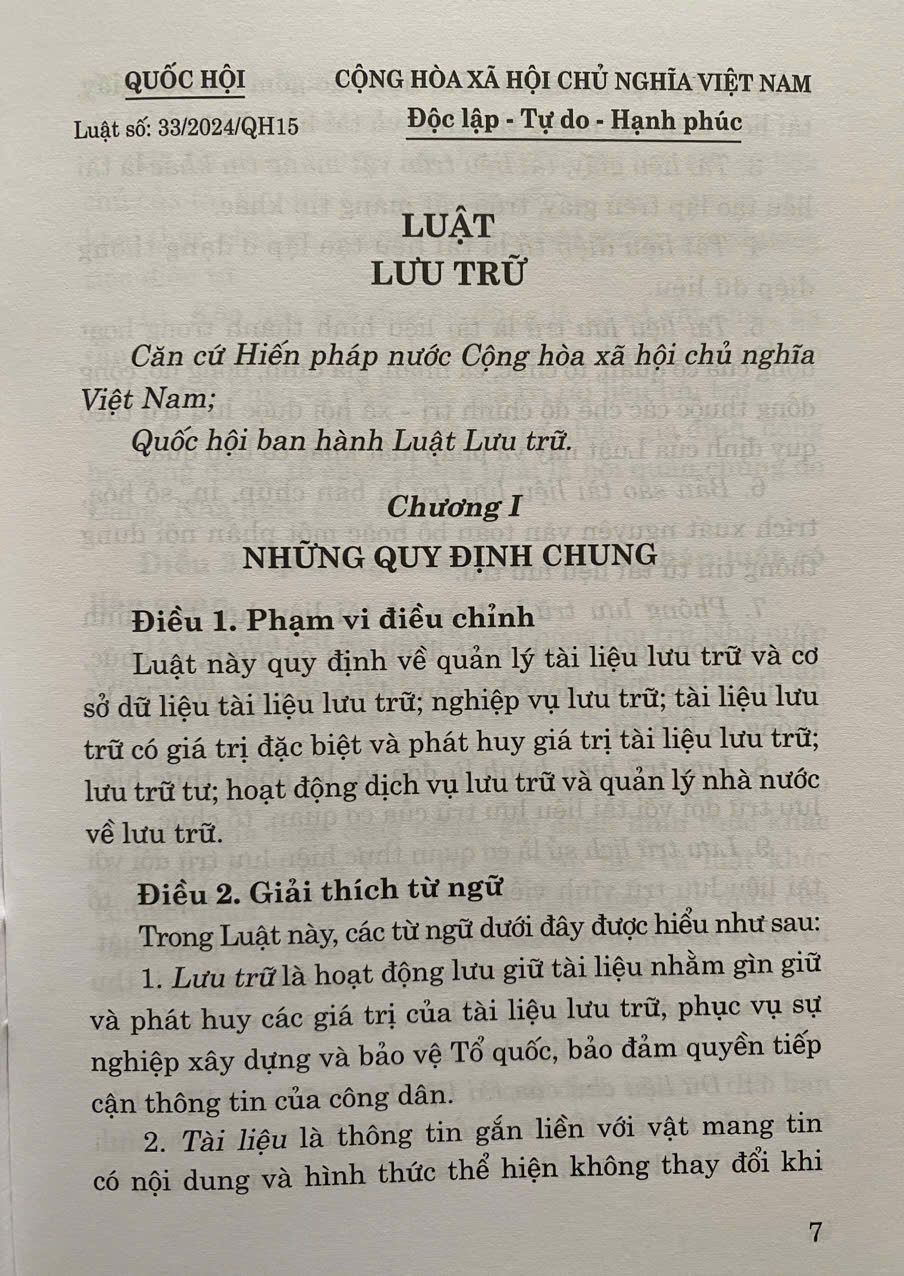 Luật Lưu Trữ số 33/2024/QH15 đã được Quốc Hội khoá XV thông qua ngày 21-06-2024. Luật gồm có 8 chương, 65 điều . Luật có hiệu lực áp dụng từ ngày 01-07-2025
