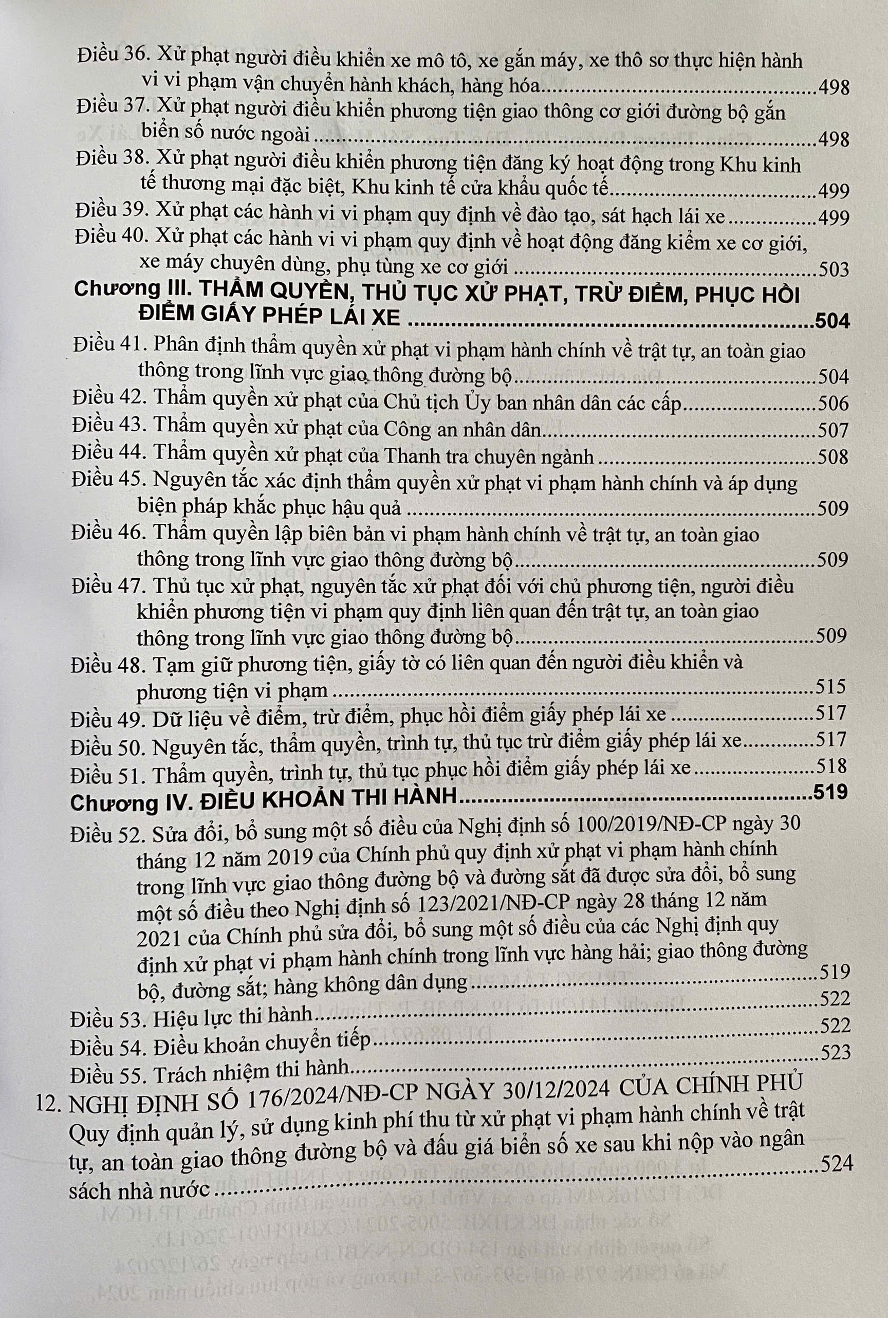 Luật Trật tự, an toàn giao thông đường bộ số 36/2024/QH15 được Quốc hội thông qua ngày 27/6/2024, có hiệu lực thi hành từ ngày 1/1/2025 với nhiêu điêm mới như: thay đổi phân hạng giây phép lái xe; tăng độ tuổi tối đa của người lái xe; bổ sung quy đ. ịnh trừ điêm giây phép lai xe; từ 01/01/2026, không được cho trẻ em dưới 10 tuổi và chiều cao dưới 1,35 mét ngồi cùng hàng ghế tài xế...   Nghị định 168/NĐ-CP ngày 26-12-2024 của Chính Phủ quy định xử phạt vi phạm hành chính trong lĩnh vực giao thông đường bộ, trừ điểm, phục hồi điểm giấy phép lái xe, thay thế cho Nghị định 100/2019 (sửa đổi, bổ sung tại Nghị định 123/2021) sẽ tăng mức xử phạt vi phạm hành chính rất cao, có những lỗi gấp cả chục lần so với trước đây.   Nhằm góp phần phổ biến những quy định pháp luật mới về an toàn giao thông đường bộ cho các cơ quan ban ngành , cá nhân trong và ngoài nước Luatvietbook xin trân trọng giới thiệu cuốn sách " LUẬT TRẬT TỰ, AN TOÀN ĐƯỜNG BỘ VÀ VĂN BẢN HƯỚNG DẪN "