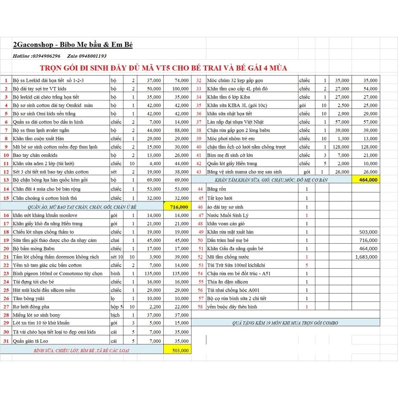 Combo đi sinh cho mẹ và bé VT5, trọn gói sơ sinh đầy đủ tặng 15 món 0đ 2Gaconshop MÔ TẢ SẢN PHẨM Nhiều mẹ dự sinh lần đầu các mẹ thường chưa có kinh nghiệm để sét up ra những thứ thực sự cần thiết dùng cho mẹ và bé chuẩn bị đi sinh, nên các mẹ thường rất khó khăn trong việc chọn lựa mua sắm những gì để không bị thừa cũng như không bị thiếu những món cần thiết - 2Gaconshop em set up sẵn ra 1 bộ combo tiết kiệm Vt5 này giành cho các mẹ nhé. gói combo đi sinh đầy đủ này rất tối ưu chi phí cho các mẹ luôn với múc giá chỉ 1,683K - sắm nguyên 1 trọn gói đi sinh này các mẹ cứ yên tâm sẽ không lo thừa thiếu đồ k đang có đâu nhé. - Ưu đãi cho các mẹ mua trọn gói đi sinh đầy đủ 2Gaconshop có tặng cho các mẹ 16 món đồ cho bé với giá 0đ, Trọn gói Combo này các mẹ nhận về cho em 60 mã sản phẩm các loại khác nhau nha, rất là nhiều đồ luôn ạ, bao gồm đầy đủ tất tật mọi thứ từ a-z , từ những vật dụng nhỏ tới lớn cho mẹ và bé luôn nha Gói combo đi sinh cho mẹ và bé với giá ưu đãi ,có màu cho bé trai và gái Bé trai em sét up các tông màu mạnh mẽ như xanh, xám, trắng Bé gái em ưu tiên các màu hồng, trắng, vàng cho bé nha, Combo bên em ưu tiên sét up chất lượng sản phẩm nên mẹ hoàn toàn yên tâm mua sắm mẹ nhé. QUY CÁCH ĐÓNG GÓI Trọn gói combo rất nhiều đồ lại có những đồ dễ vỡ nữa nên em sẽ đống chống sốc 2 lớp cẩn thận và gọn gàng cho các mẹ để giảm thiểu tối đa việc hư hỏng đồ nhé. Mẹ nhận hàng sẽ có 1 tờ hóa đơn chi tiết tất cả các món đồ trong combo đi kèm đơn hàng để các mẹ kiểm tra và rà soát lại đơn hàng của mình nha, nếu có vấn đề về đơn hàng như thiếu hàng hay hư hỏng, các mẹ ib lại shop em để shop em xử lý đơn hàng cho mình nhé. #2Gaconshop #combodisinh #trongoi #tronbososinh #sosinh #khansua #sosinhtrongoi #mevabe #goidisinh #giodisinh #tronbososinhchobe