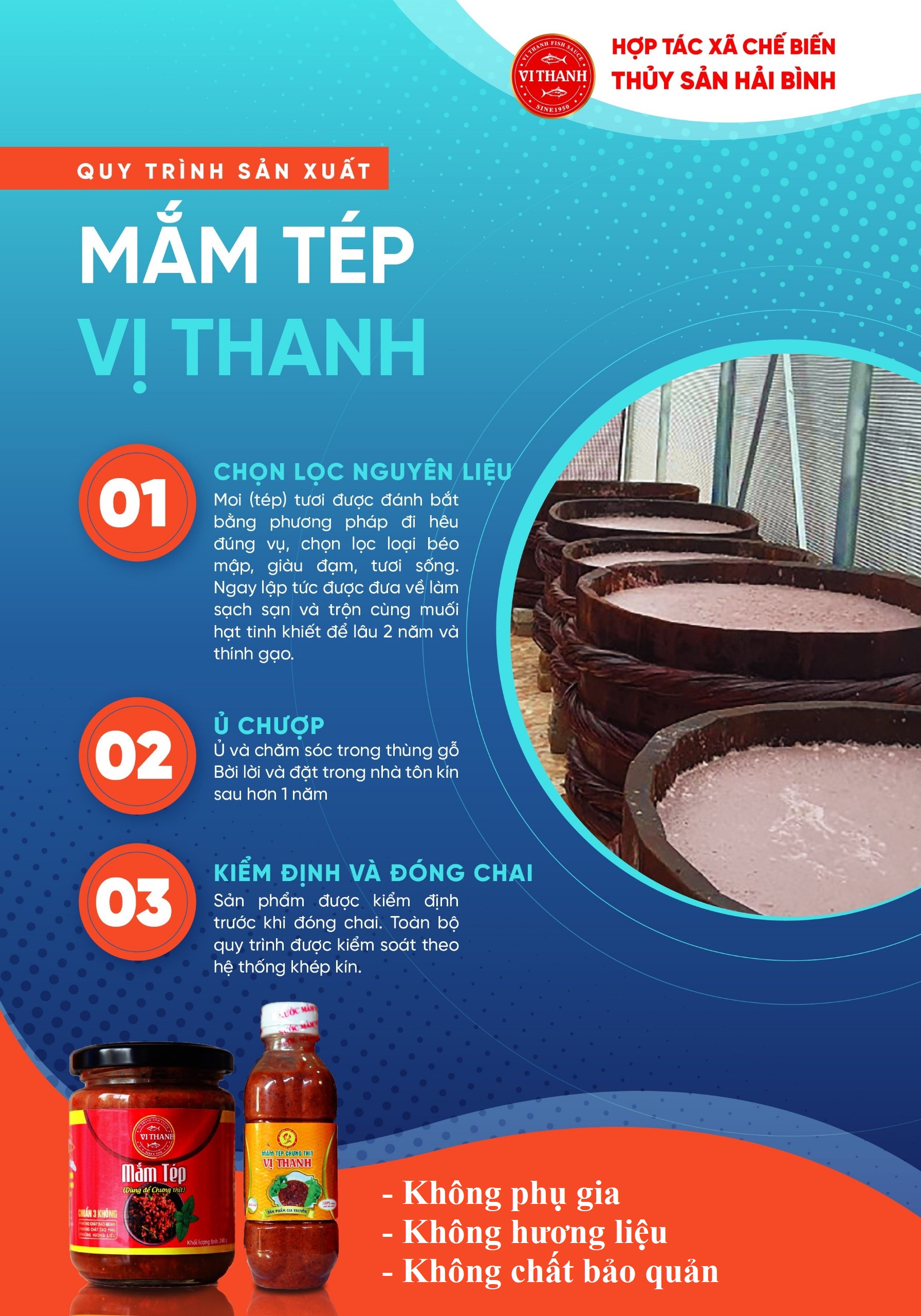 Từ con tôm (ruốc/khuyết/moi) biển tươi trộn muối hạt tinh khiết, ủ lên men tự nhiên trong thùng gỗ bời lời theo phương pháp nén gài truyền thống. Sau 12 tháng chăm sóc, những mẻ mắm thơm dịu, vị thanh, màu sim chín hoàn toàn tự nhiên được tạo thành mắm tép Vị Thanh.   Sự khác biệt: ➤ Sản phẩm được ủ trong thùng gỗ, theo quy trình khép kín đảm bảo VSATTP. ➤ Mắm tép sạch truyền thống, không hóa chất, hoàn toàn tự nhiên. ➤ Ngọt bùi vị đạm – thơm bùi vị mắm – mùi dịu nhẹ – vị ngọt thanh. Thông tin chi tiết: ➤ Đạm tổng số: >20gN/l; ➤ Đạm amin (acid amin): >50%; ➤ Không có E.Coli, Cl.perfrigens, Stafplylococus aureus. ➤ Màu sắc: nâu đỏ. ➤ Mùi: Mùi thơm tự nhiên của mắm chua chín, không tanh. ➤ Vị: Đậm, ngọt dịu của đạm, không chát, không xẳng, không có vị lạ. Lưu ý khi sử dụng ➤ Bảo quản nơi khô ráo, tránh ánh sang mặt trời, đậy nắp kín sau khi sử dụng. ➤ Ngon hơn khi pha với nước cốt chanh, đường. Có thể giảm bớt vị tanh bằng cách hấp nóng. Thành phần: moi biển tươi, muối tinh, thính ngô, gạo rang, giềng Hướng dẫn sử dụng: Dùng để chưng thịt, chấm rau, củ, quả, thịt luộc, Dung tích: 300ml tương đương với 300g