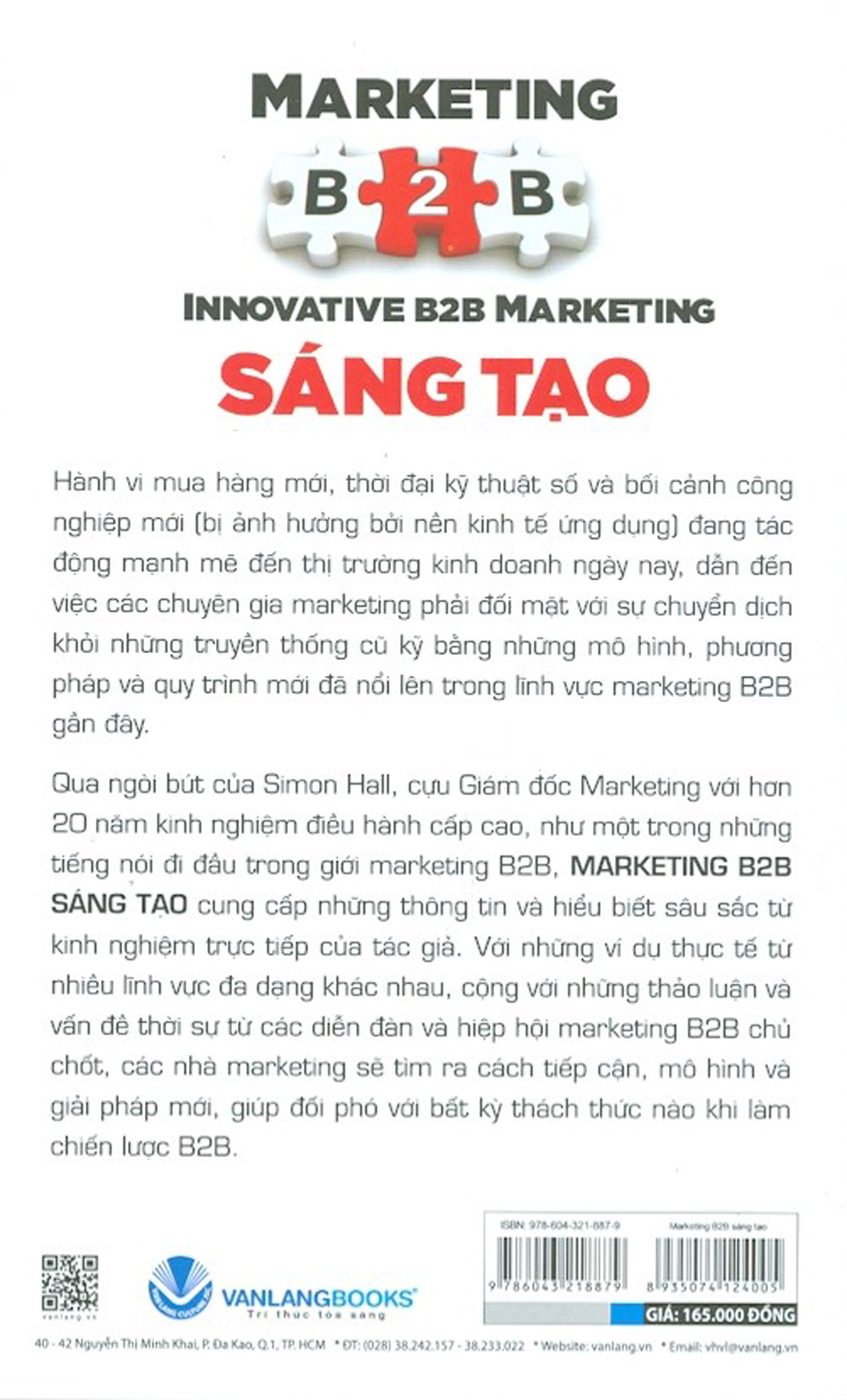 Qua ngòi bút của Simon Hall, cựu Giám đốc Marketing với hơn 20 năm kinh nghiệm điều hành cấp cao, như một trong những tiếng nói đi đầu trong giới marketing B2B, Marketing B2B sáng tạo cung cấp những thông tin và hiểu biết sâu sắc từ kinh nghiệm trực tiếp của tác giả. Với những ví dụ thực tế từ nhiều lĩnh vực đa dạng khác nhau, cộng với những thảo luận và vấn đề thời sự từ các diễn đàn và hiệp hội marketing B2B chủ chốt, các nhà marketing sẽ tìm ra cách tiếp cận, mô hình và giải pháp mới, giúp đối phó với bất kỳ thách thức nào khi làm chiến lược B2B.
