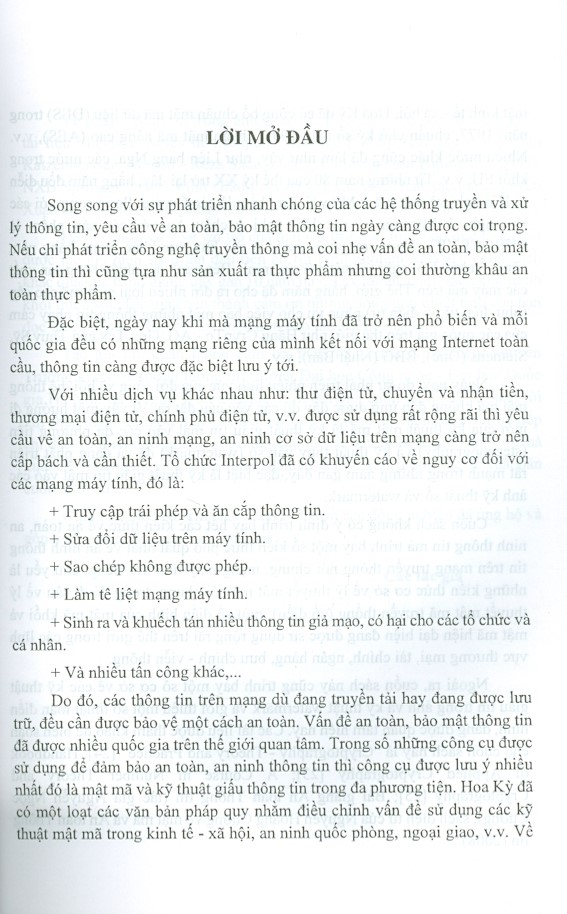 Cung cấp các kiến thức về mật mã và an toàn thông tin bao gồm: vấn đề an toàn - an ninh thông tin, một số kiến thức bổ trợ, một số hệ mật mã