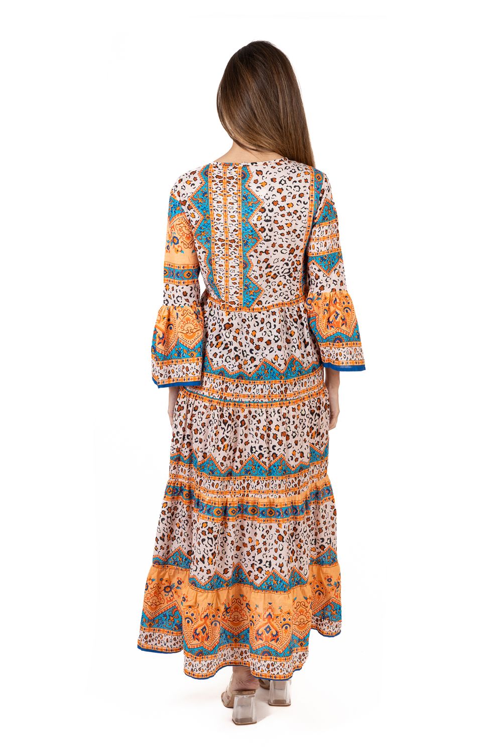 Maxi Boho Dài Tay Kết Cườm Cotton Isla Bonita, chất liệu cotton cao cấp, mềm mại, nổi bật phần ngực trước kết cườm sang trọng. Họa tiết thổ cẩm độc đáo. Phom suông. Dài Đầm
