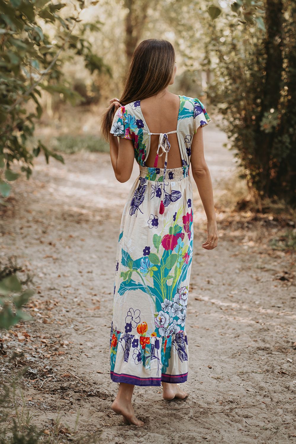 Maxi 2 Dây Isla Bonita, chất lụa mềm mại, thoáng mát. nền vải vẽ ánh kim tinh tế. Dây nơ rời cột nhẹ ở eo. Có thể mặc cột nơ hoặc không nơ như đầm
