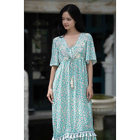 Maxi Cổ V Cotton Isla Bonita, chất liệu lụa mềm mại, cao cấp, nền vải trắng trang nhã họa tiết xanh tinh tế. Có thể mặc cổ V hoặc kéo thành trễ vai. Eo thun
