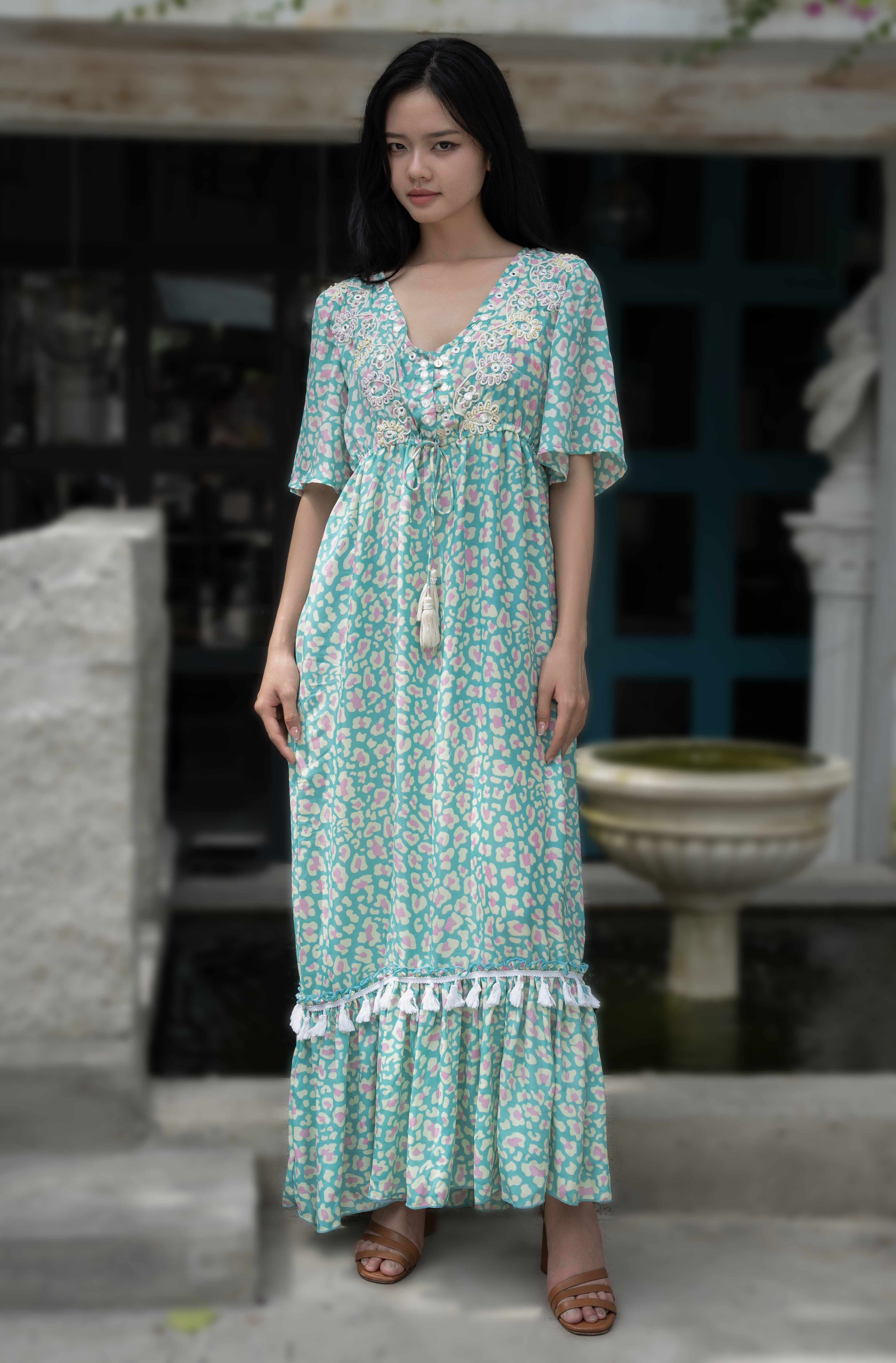 Maxi cotton mềm mại, đính hạt phối ren cao cấp, họa tiết ấn tượng. Phom suông rộng. Dài 120cm. (45x120) Phù hợp đi biển, dạo phố, công sở, hoặc dự tiệc. Hướng dẫn sử dụng: