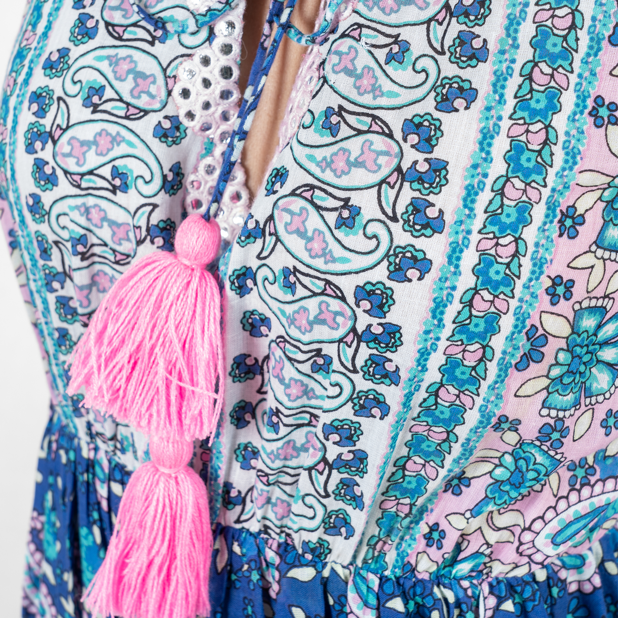 Maxi Hoa Phối Ren Ánh Bạc Cotton Isla Bonita chất liệu cotton cao cấp, mềm mại. Nổi bật phần cổ áo phối ren kết ánh bạc, nơ tua rua màu hồng nữ tính. Họa tiết