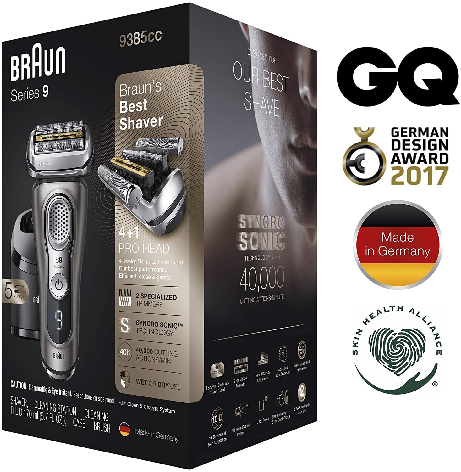 Dao cạo cao cấp của Braun: 4 + 1 đầu cạo. Có hiệu quả. Triệt để. Thoải mái cho da. Sản xuất tại Đức 9385cc + Series 9 – hiện có hiệu suất pin cao hơn 20% so với Series 9 trước đó và màn hình Pro với chỉ báo khi nào cần làm sạch dao cạo và thay bộ phận cạo. Chỉ cần sạc nhanh 5 phút là đủ cho 1 lần cạo râu. Làm sạch và trạm sạc – bây giờ với lựa chọn chương trình thông minh. Chương trình làm sạch được chọn tự động, máy cạo râu được làm sạch, tra dầu, bảo dưỡng, sấy khô và sạc. Màn cạo râu xuất sắc của Braun. Có hiệu quả. Kỹ lưỡng. Nhẹ nhàng trên làn da của bạn. Thích hợp cho cạo khô và ướt. Hiệu quả cao nhất: 5 phần tử dao cạo bắt được nhiều lông hơn trong một lần vuốt so với bất kỳ loại dao cạo nào khác. Độ mềm mại cao nhất: Các rung động âm thanh trong dao cạo đảm bảo sự lướt nhẹ trên da để tạo sự thoải mái tối đa.