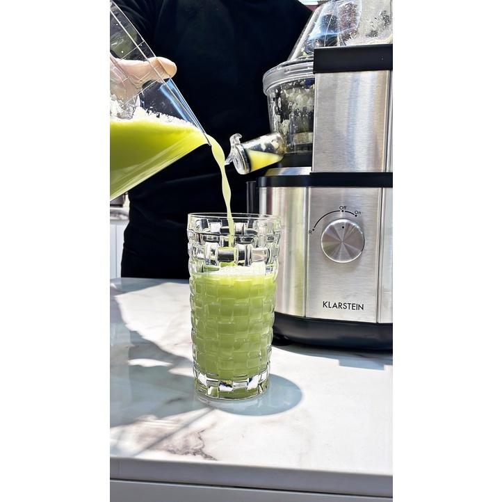 Thông số kỹ thuật của Máy ép chậm Klarstein 400w - Thân ngoài máy được làm bằng thép không gỉ phủ sơn cao cấp - Ống chứa hoa quả phía trên với bề rộng mặt lên