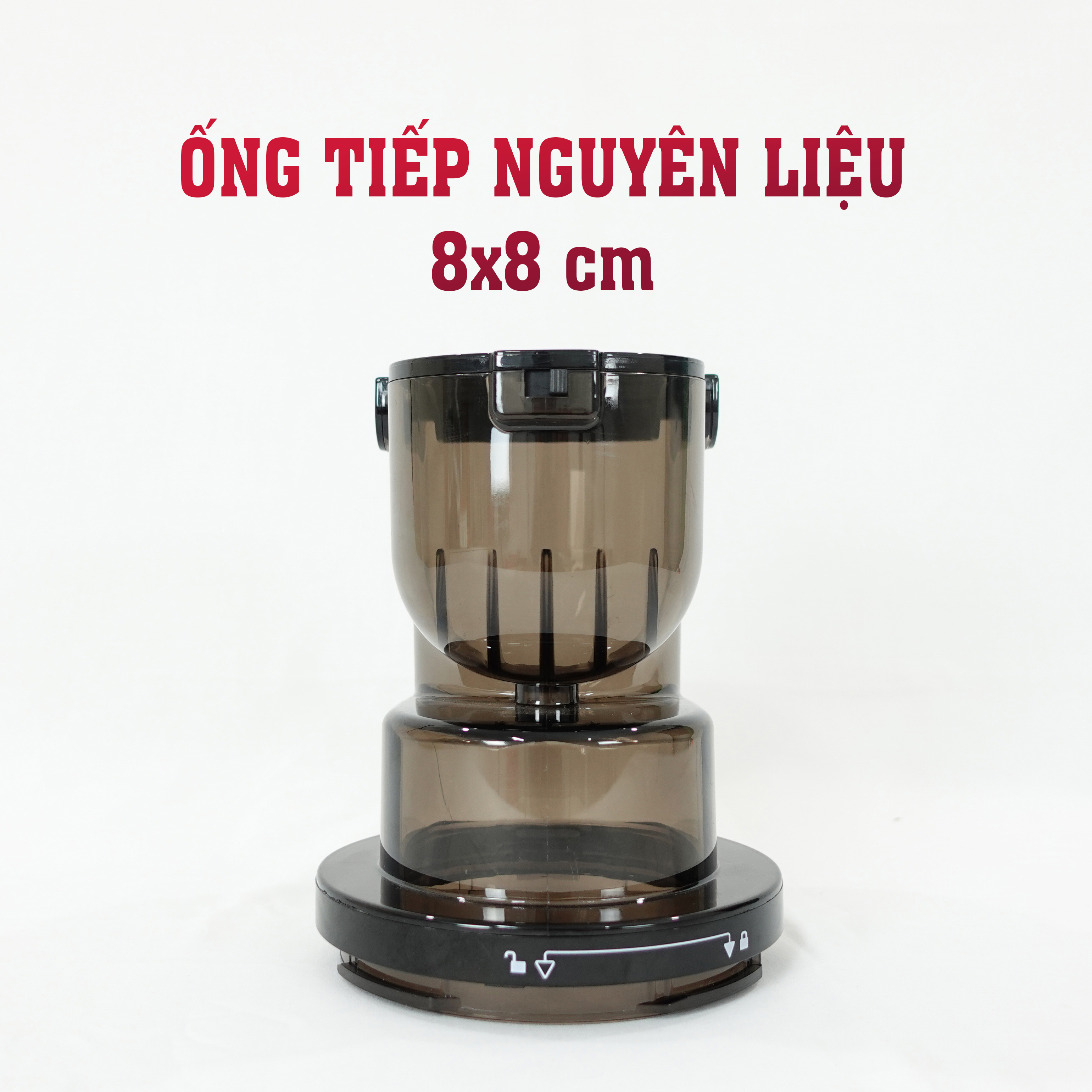 Ưu điểm nổi trội của máy ép chậm so với máy ép trái cây thông thường - Đường kính lớn 7.8cm, không cần cắt nhỏ, ép trực tiếp - Tỷ lệ nước ép nguyên chất