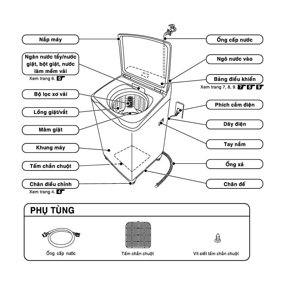 Thông số cơ bản Xuất xứ: Việt Nam Kích thước (R x S x C) (mm): 560 x 630 x 1035 Khối lượng tịnh: 35 Thông số kỹ thuật Khối lượng giặt (KG): 10