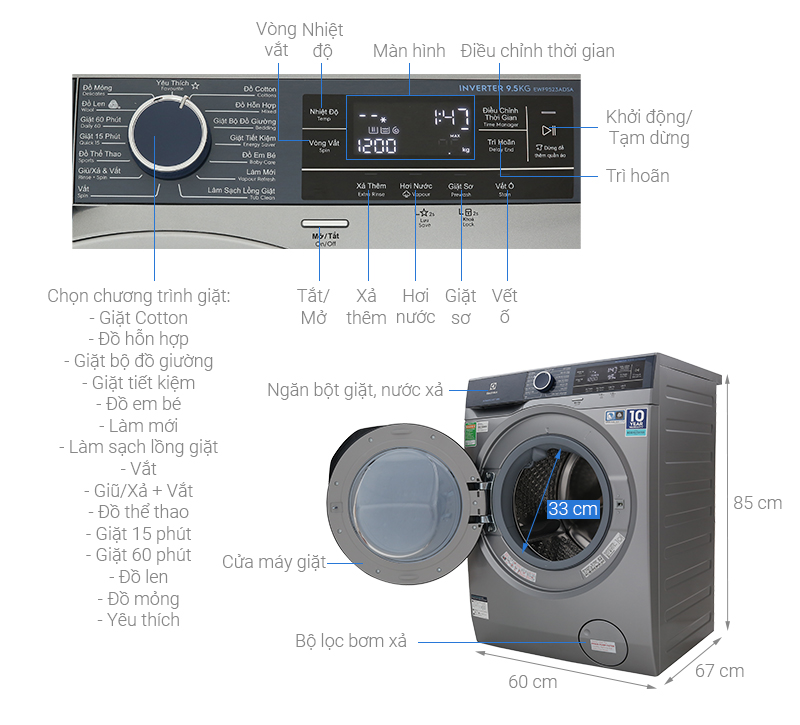 Đặc điểm nổi bật - Khối lượng giặt 10.5 kg thích hợp với gia đình từ 7 thành viên trở lên. - Công nghệ suy luận Fuzzy Logic, tự động suy luận và đưa ra mức nước tương ứng với lượng quần áo cần giặt. - Công nghệ Steam Wash, giặt hơi nước giúp quần áo sạch hơn, có khả năng diệt khuẩn và giảm các tác nhân dị ứng. - Công nghệ giặt nước nóng mang đến khả năng kháng khuẩn, dễ dàng giặt sạch các vết bẩn cứng đầu. - Công nghệ Inverter tiết kiệm điện, nước hiệu quả. - Tổng quan - Loại máy giặt:Cửa trước - Lồng giặt:Lồng ngang - Khối lượng giặt:10.5 Kg - Số người sử dụng:Trên 7 người - Kiểu động cơ:BLDC - Tốc độ quay vắt tối đa:1400 vòng/phút - Chất liệu lồng giặt:Thép không gỉ - Chất liệu vỏ máy:Kim loại sơn tĩnh điện - Chất liệu cửa máy:Kính cường lực Mức tiêu thụ điện