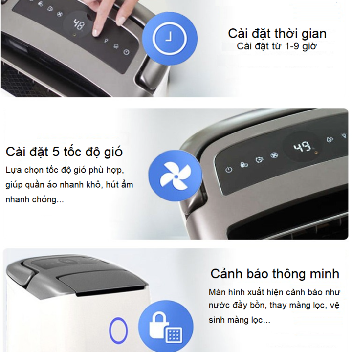 - Chức năng nhắc nhở thông minh: Khi bình chứa đầy nước sẽ nhắc nhở, bạn không cần lo lắng về việc tràn nước và nhắc nhở bạn đổ nước kịp thời để tiếp tục hút ẩm. Chức năng hẹn giờ: 1 đến 9 giờ để lựa chọn. Tiết kiệm thời gian và công sức của bạn để tận hưởng không khí trong lành. Cài đặt tốc độ gió có 5 tốc độ. Tốc độ gió có thể dễ dàng điều chỉnh theo độ ẩm trong nhà. Cảm biến thông minh