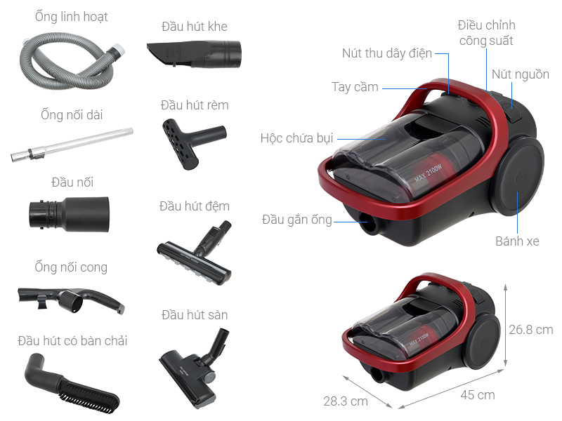 - Công suất đầu vào mạnh mẽ 2100W, làm sạch nhà cửa nhanh chóng và hiệu quả