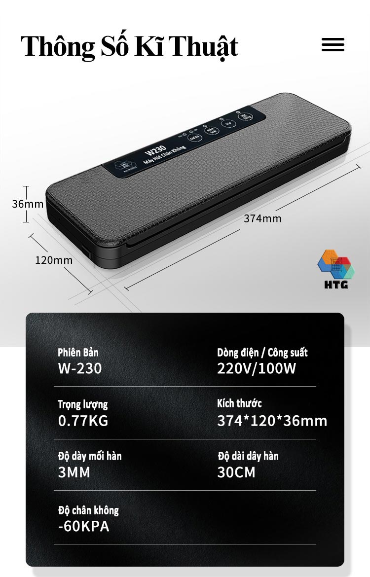 • Độ chân không : -60 Kpa. Trên tay và Hướng Dẫn sử dụng Máy hút chân không thực phẩm W230