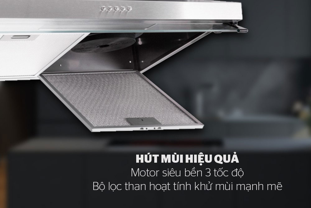 Máy hút mùi cổ điển Inox 304 02 Động cơ bằng đồng nguyên chất, điều khiển cơ 03 tốc độ Hệ thống cánh quạt làm bằng chất liệu nhựa chịu nhiệt Bộ phận lưới lọc kép Aluminum có màng chắn inox thêm chắc chắn 02 vỉ lọc than hoạt tính Đèn HALOGEN 1×40W