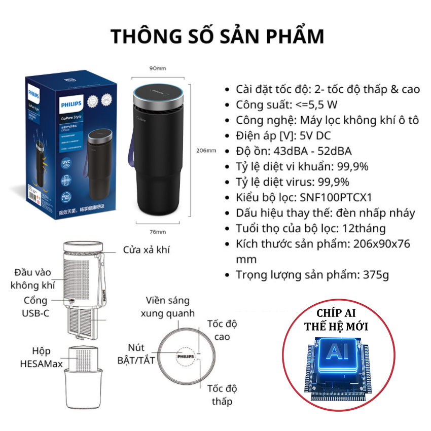 - Sử dụng công nghệ UVC LED của Philips, không có ozone, không giải phóng thuy ngân