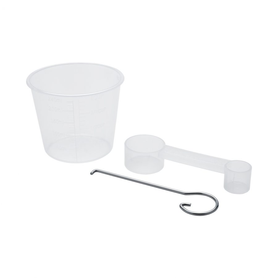 Phụ kiện gồm cốc đo, thìa đo và công thức nấu ăn.