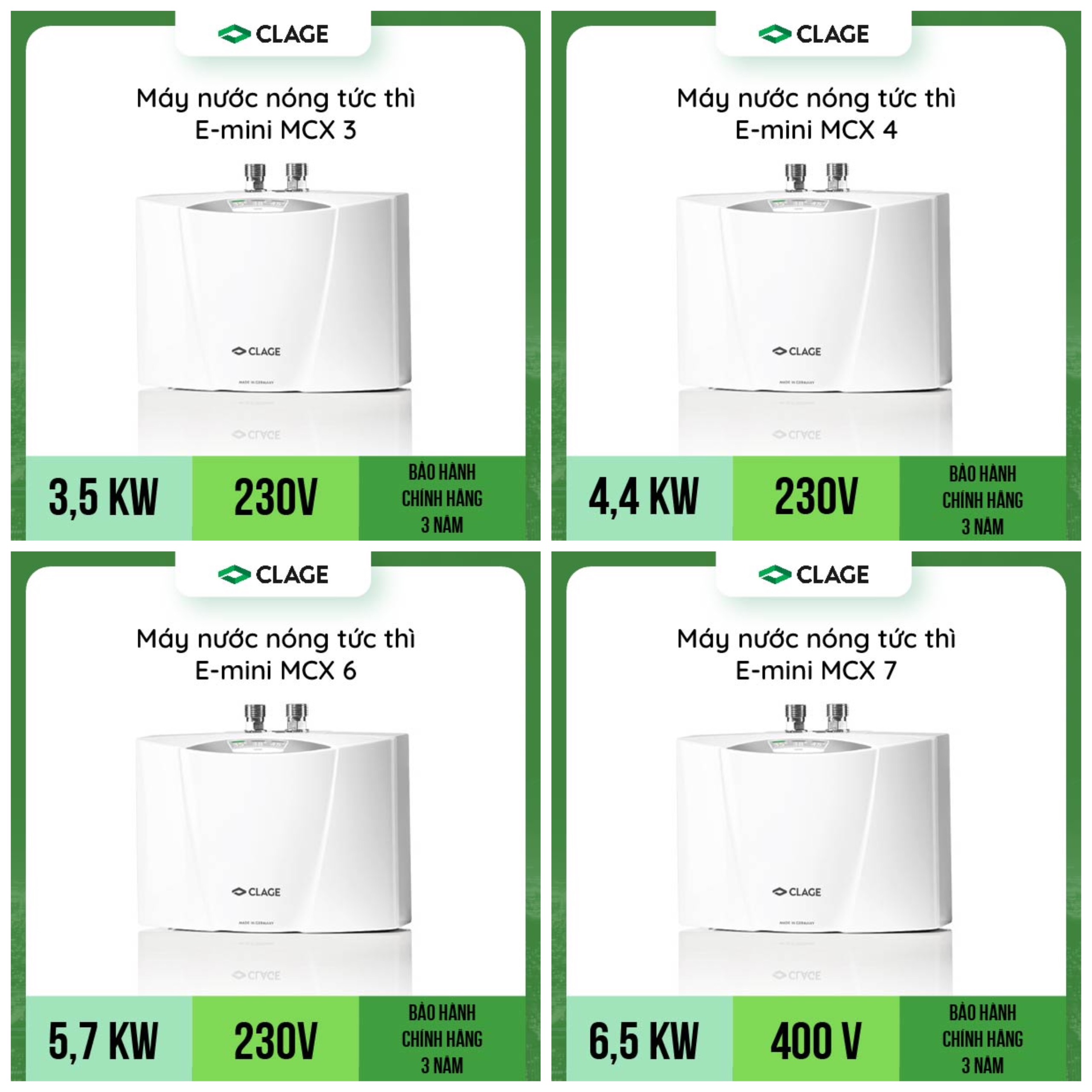 Được thừa hưởng phong cách thiết kế tinh xảo của nền công nghiệp Đức – Các sản phẩm thuộc dòng MCX sở hữu dáng vẻ hiện đại, nhỏ gọn, chắc chắn và cực kỳ tối ưu cho người sử dụng. Công nghệ độc quyền, an toàn tuyệt đối. Kể từ khi thành lập năm 1951, nhờ phát hiện ra khả năng ứng dụng nguyên tắc vật lý cơ bản vào thực tế sản phẩm là dùng trở kháng cao của dòng nước để tạo thành 1 điện trở tự nhiên, giúp cách ly dòng điện đảm bảo an toàn cho người dùng. CLAGE đã triệt để áp dụng nguyên tắc này trong các thiết bị của mình. Hiện tại, CLAGE đang là thương hiệu sở hữu độc quyền công nghệ này trên toàn thế giới. Nhiệt độ nước đầu ra được kiểm soát tối ưu, hoàn toàn không cần pha thêm nước lạnh để đạt được nhiệt độ nước mong muốn, cũng không cần lo lắng về nhiệt độ nước quá nóng gây nguy hiểm cho người dùng.  Kiểm soát trực quan, điều khiển dễ dàng và hiện đại: Bạn sẽ dễ dàng và nhanh chóng có được nước ấm để sử dụng trong chỉ vài giây. Đồng thời với 3 mức nhiệt độ được cài đặt sẵn là 35°C, 38°C hoặc tối đa 45°C, lựa chọn thông qua các phím bấm cảm ứng giúp người dùng tối thuận tiện lựa chọn nhiệt độ nước mà mình thấy thoải mái nhất. Trên thiết bị chính đã được tích hợp sẵn các phím bấm cảm ứng để lựa chọn mức nhiệt độ phù hợp sử dụng, đồng thời có thể nâng cấp thêm các tính năng điều khiển từ xa thông qua sóng FM, hoặc ở phiên bản cao cấp nhất có thể dùng điều khiển thông qua app “Smart Control” trên smartphone hoặc máy tính bảng.  Tiết kiệm năng lượng với công nghệ độc quyền.  Tiết kiệm năng lượng luôn là một ưu tiên trong thiết kế bất kỳ sản phẩm nào của CLAGE. Các sản phẩm của CLAGE nói chung hay đặc biệt là dòng MCX sử dụng phương pháp đun nóng bằng tiếp xúc điện cực trực tiếp với dòng nước, nhờ đó hiệu năng chuyển đổi năng lượng gần như 100%. Nước nóng sẵn sàng sử dụng chỉ sau 2 giây và không có năng lượng hao phí.  Hoạt động bền bỉ không đóng cặn vôi Nhiệt độ nước đầu ra được kiểm soát hoàn toàn là yếu tố tiên quyết để ngăn chặn các phản ứng hóa học tạo cặn canxi bên trong đường ống dẫn, từ đó tăng độ bền cho thiết bị. Máy làm nước nóng tức thì MCX kiểm soát nhiệt độ không vượt quá 45 độ C giúp xử lý triệt để tình trạng đóng cặn canxi này. Giúp cho sản phẩm có thể dễ dàng lắp đặt dưới bất kỳ chậu rửa tay hay các hộc tủ trong bộ tủ bếp.  Thiết kế nguyên khối, hình dáng nhỏ gọn với các đầu nối van nước tiện lợi giúp cho máy làm nước nóng tức thì MCX của CLAGE có thể lắp đặt ở bất kỳ vị trí nào, dưới chậu rửa tay nhà tắm, dưới chậu rửa quầy ba hay trong các hộc tủ nhà bếp đều có thể dễ dàng lắp đặt.   Theo các thông số kỹ thuật như công suất máy, dòng điện đầu vào và lưu lượng nước đầu ra, máy nước nóng tức thì dòng MCX sẽ được chia thành MCX 3, MCX 4, MCX 6, MCX 7.   Hướng dẫn lắp đặt thiết bị: