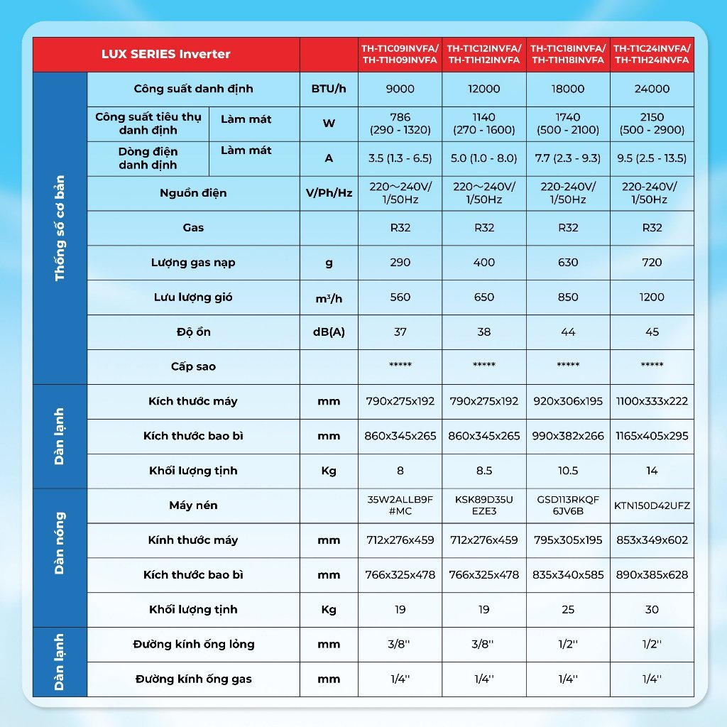 LƯU Ý: ● ĐƠN HÀNG KHÁCH Ở HỒ CHÍ MINH --- SHOP GIAO MIỄN PHÍ (TRỪ CẦN GIỜ). THÔNG TIN SẢN PHẨM: Phạm vi làm lạnh hiệu quả: Dưới 15m² (từ 30 đến 45m³) Công suất sưởi ấm: Không có sưởi ấm Lưu lượng gió lạnh (m³/phút): Cao: 7.8 - Trung bình: 6.7 - Thấp: 5.0 Dòng điện hoạt động: 5A Độ ồn trung bình: 50 dB Dòng sản phẩm: 2025 Sản xuất tại: Thái Lan Chất liệu dàn tản nhiệt: Ống dẫn gas bằng Đồng - Lá tản nhiệt bằng Nhôm Loại Gas: R-32 Tiêu thụ điện: 0.92 kW/h Nhãn năng lượng: 5 sao (Hiệu suất năng lượng 4.28) Công nghệ tiết kiệm điện: Dual inverterEnergy Ctrl - Kiểm soát năng lượng chủ động 4 mức Lọc bụi, kháng khuẩn, khử mùi: Bộ lọc PM 2.5Màng lọc sơ cấp Chế độ gió: Điều khiển lên xuống tự động, trái phải tùy chỉnh tay Công nghệ làm lạnh nhanh: Jet Cool Tiện ích: Chế độ ngủ đêm tránh buốt Chức năng tự chẩn đoán lỗi Công nghệ Gold-Fin chống ăn mòn Hẹn giờ bật, tắt Điều khiển bằng điện thoại, có wifi Thổi gió dễ chịu (cho trẻ em, người già) Tự khởi động lại khi có điện Chức năng tự làm sạch Kích thước - Khối lượng dàn lạnh: Dài 75.6 cm - Cao 26.5 cm - Dày 18.4 cm - Nặng 7.4 kg Kích thước - Khối lượng dàn nóng: Dài 71.7 cm - Cao 49.5 cm - Dày 23 cm - Nặng 22.1 kg Dòng điện vào: Dàn lạnh Kích thước ống đồng: 6.35/9.52