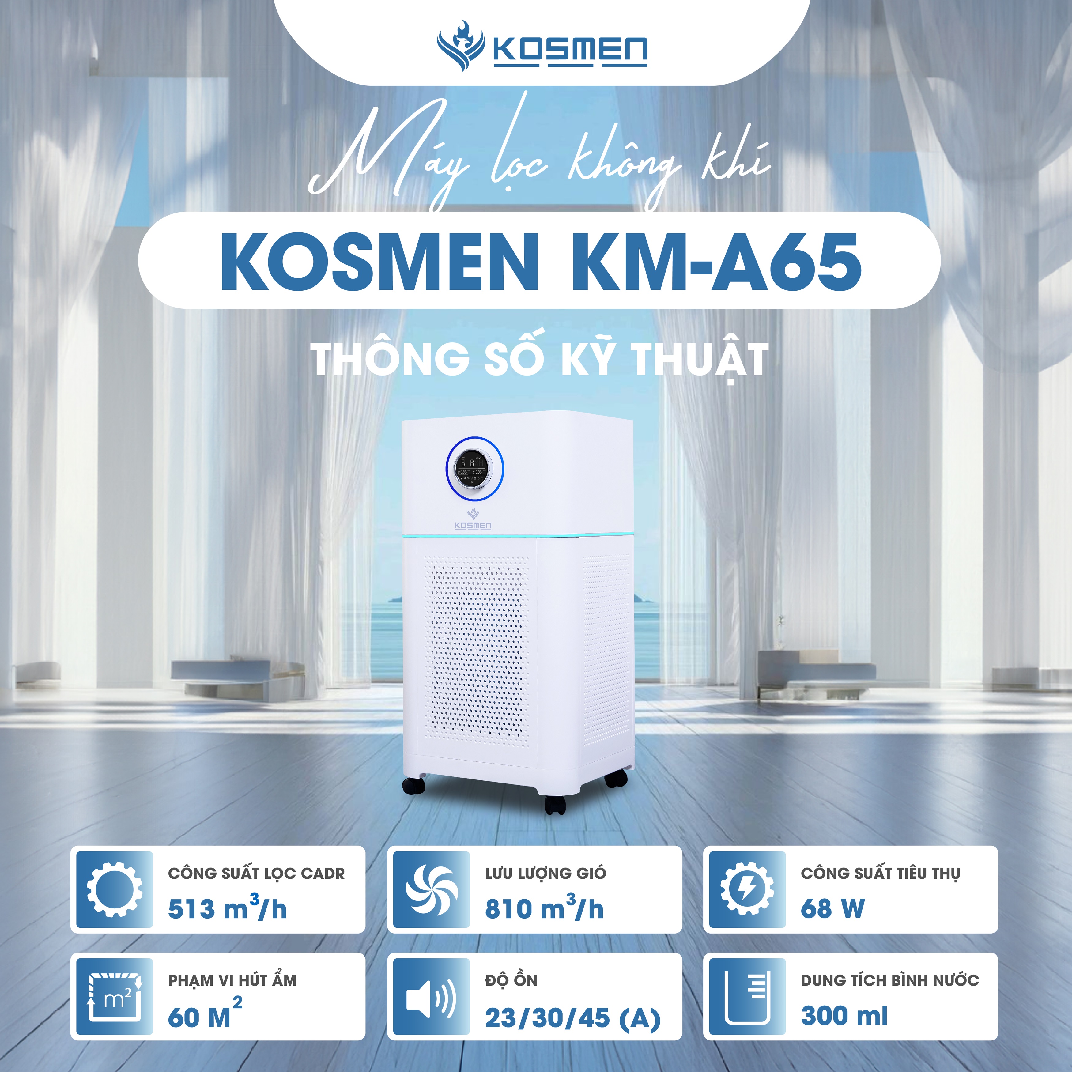 Máy lọc không khí Kosmen KM-A65 được áp dụng các công nghệ hiện đại đến từ Đức có tác dụng lọc sạch các loại bụi mịn, phấn hoa, nấm mốc, lông thú cưng và giúp loại bỏ mùi hôi hiệu quả. Chính vì vậy, Kosmen KM-A65 đã trở thành một trong những thiết bị công nghệ thông minh giúp bảo vệ không gian sống cho mọi gia đình.