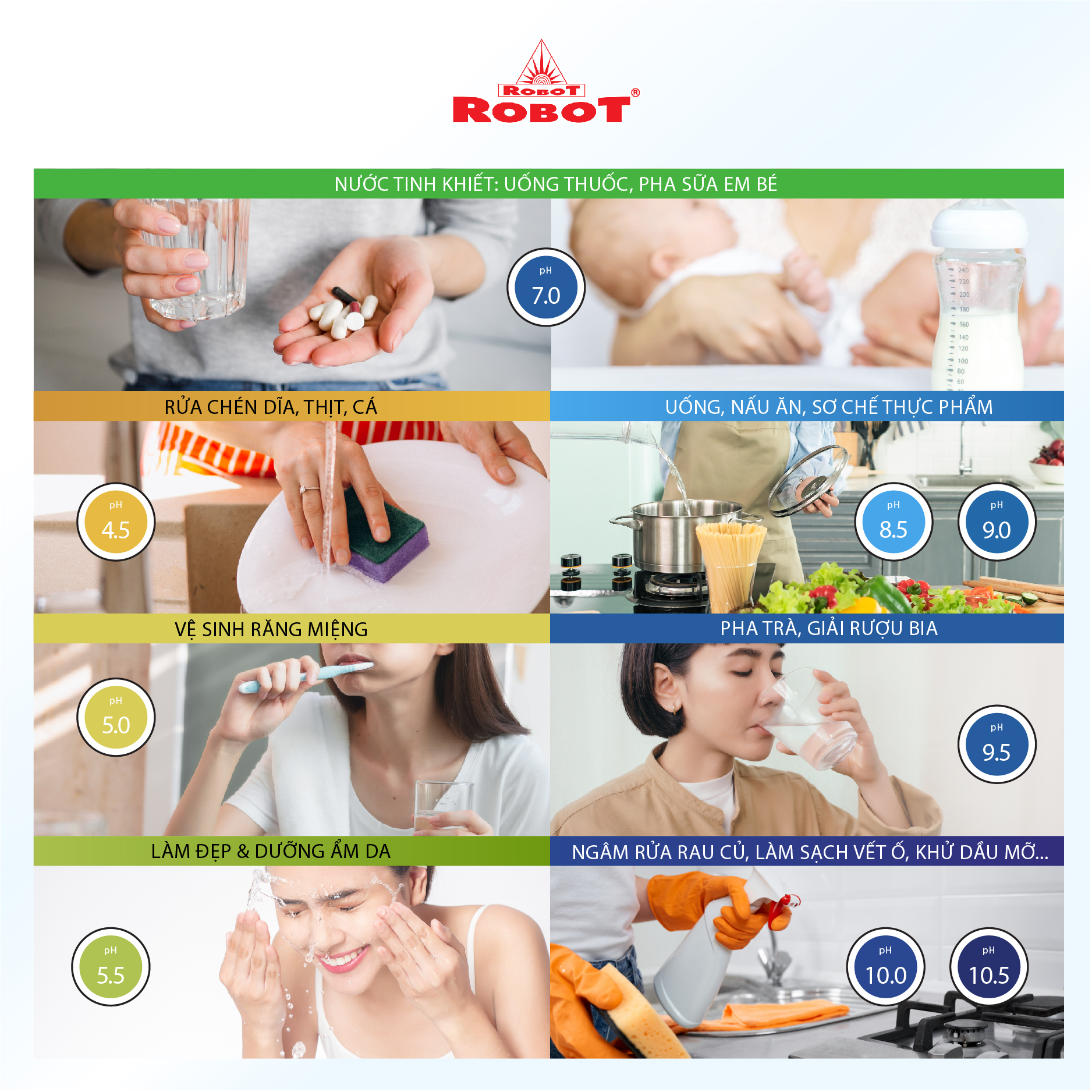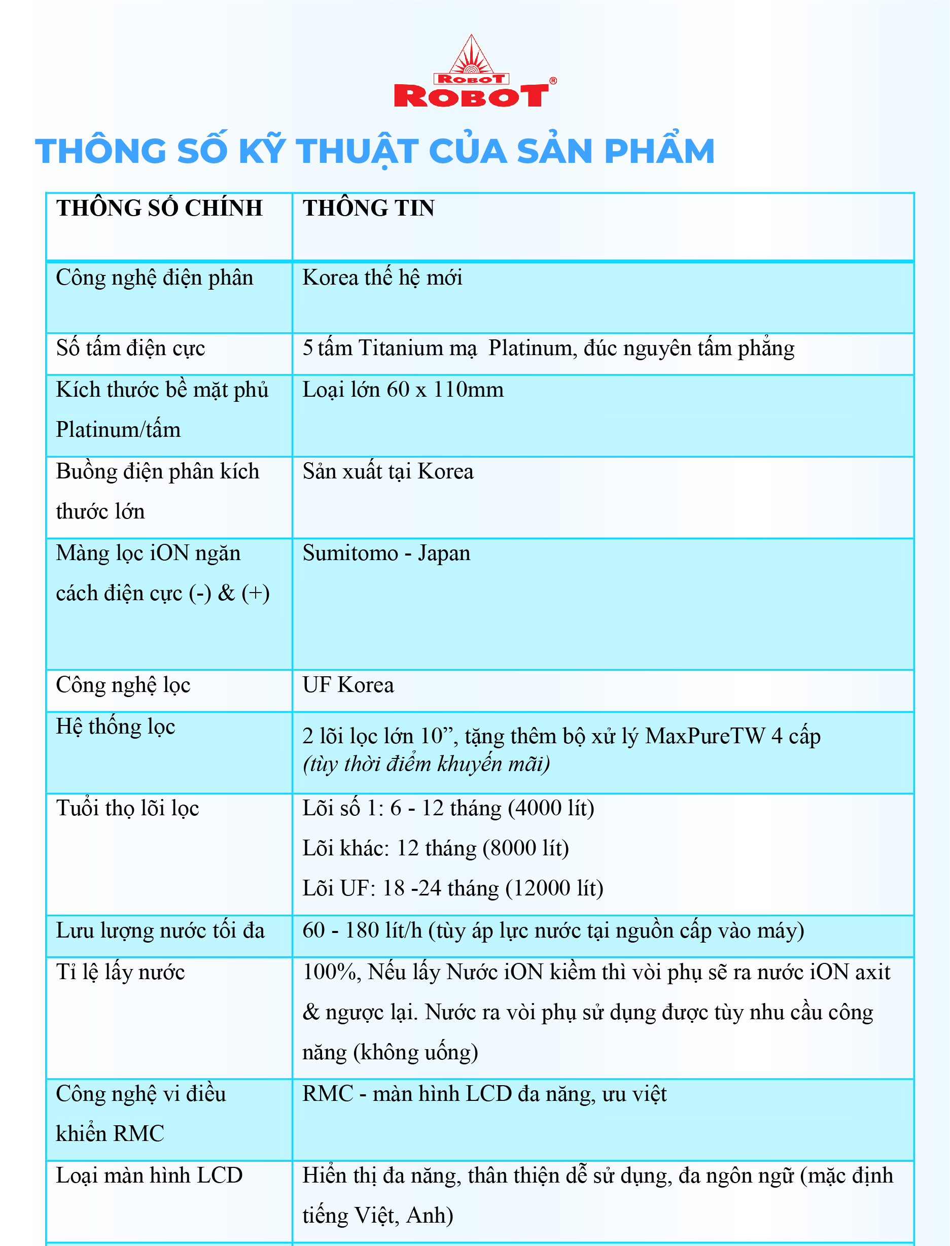 - ️ Máy lọc nước điện giải iON kiềm ROBOT ionSmart 510 là sản phẩm được sản xuất với công nghệ tiên tiến, cao cấp trang bị đến 5 tấm điện cực lớn nhất, có khả năng tạo ra đến 10 loại nước đa chức năng, với 5 mức nước iON kiềm (pH 8.5 – 10.5), nước lọc trung tính (pH 7.0) Nguội – Nóng & 3 mức nước iON axit (pH 4.5 - 5.5). Chất lượng nước đạt chỉ số tối ưu, nồng độ Hydro hoạt tính lên đến ~ 750 -> 850 ppb, chống oxy hóa (ORP) lên đến ~ -350 -> -500 mV, đáp ứng mọi nhu cầu sử dụng trong cuộc sống.