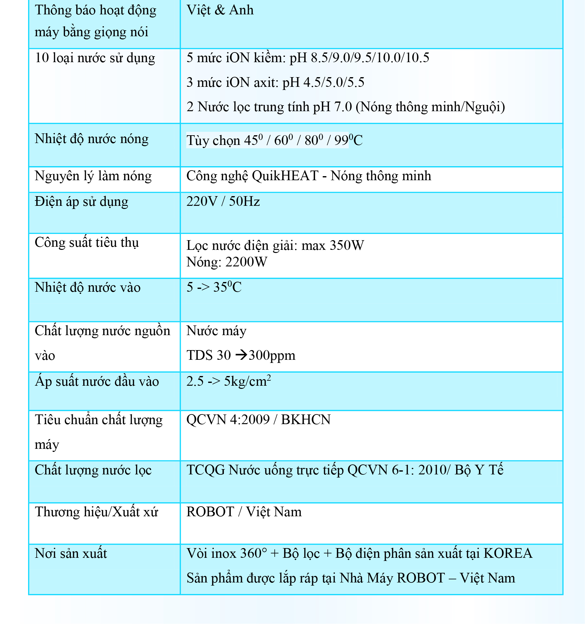 - ️ Máy lọc nước điện giải iON kiềm Nóng ROBOT ionSmart được thiết kế kiểu dáng hiện đại, thiết kế chinh phục mọi không gian. Đặc biệt, bộ sưu tập 5 sắc màu pastel hiện đại đáp ứng mọi sở thích và phong cách nội thất, chắc chắn sản phẩm sẽ là điểm nhấn đặc sắc trong ngôi nhà của bạn. ️ Máy lọc nước điện giải iON kiềm Nóng ROBOT ionSmart 510, tạo 10 loại nước bổ ích, pH 4.5 --> 10.5 - Đáp ứng mọi nhu cầu trong cuộc sống